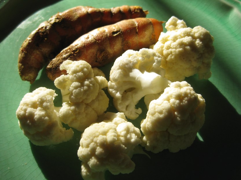 To capture the bountiful local harvest of cauliflower for the winter pantry, I put up a few jars generally following a recipe from Eugenia Bone’s Well-Preserved cookbook. For some, I followed her recipe relatively closely but for others, I added some grated fresh ginger and turmeric, which our local Whole Foods carries, presumably to cater to the large local Indian population. I’d never cooked with fresh turmeric before, so this was a learning experience. I plan on planting some in a pot to see what it produces.