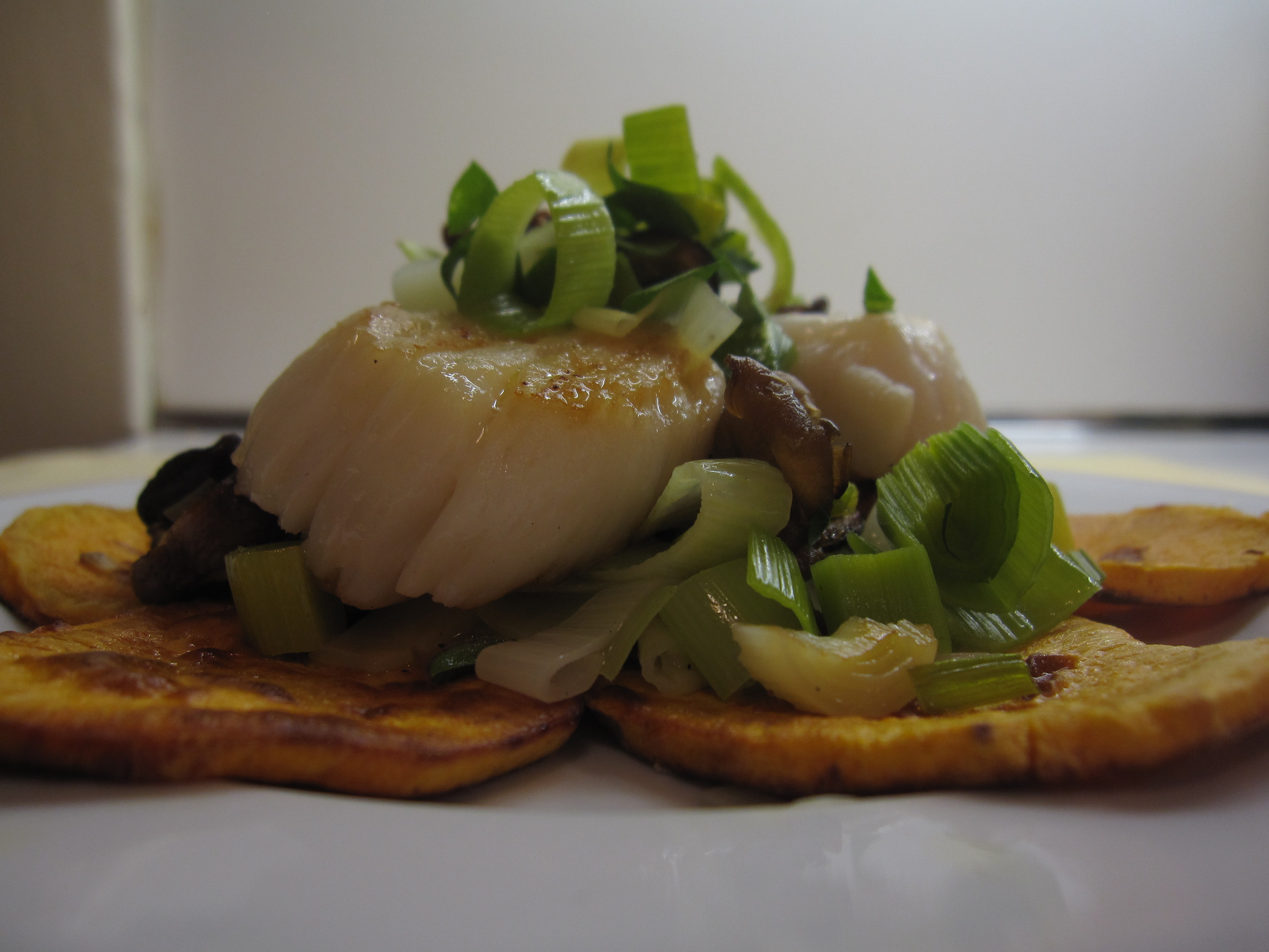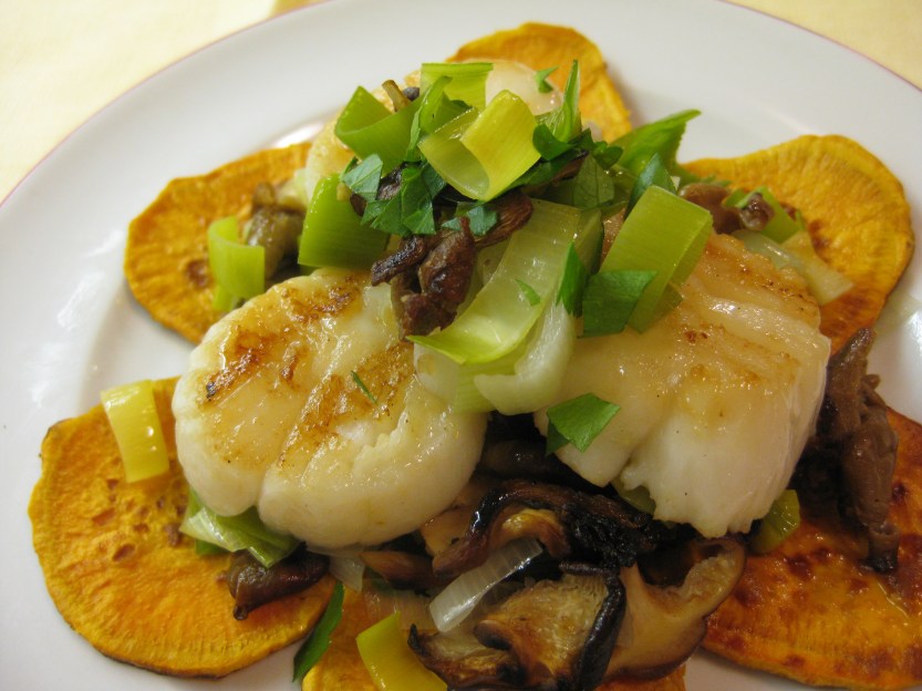 Dark Days Week 5: Sea Scallops with Mushrooms and Leeks on Sweet Potato Crisps
