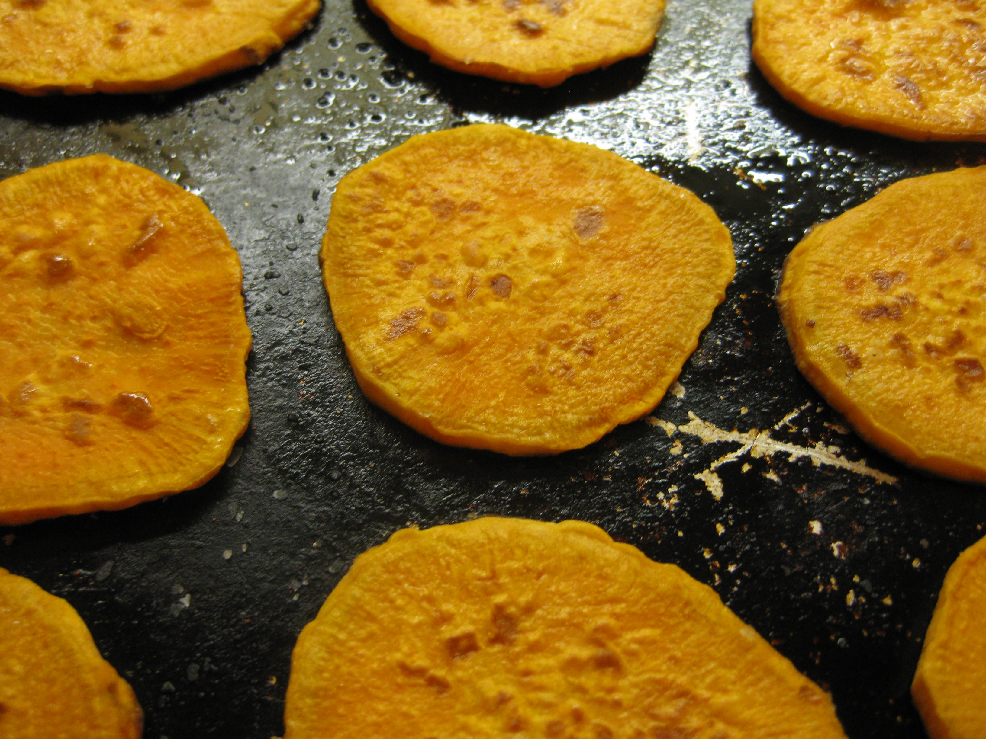 The sweet potato was peeled, thinly sliced, tossed in olive oil, salted, and roasted at 400 degrees, turning once, until browned and slightly crisp (6-10 minutes). I removed it to paper toweling to drain for a minute or two and then to a plate to let crisp.