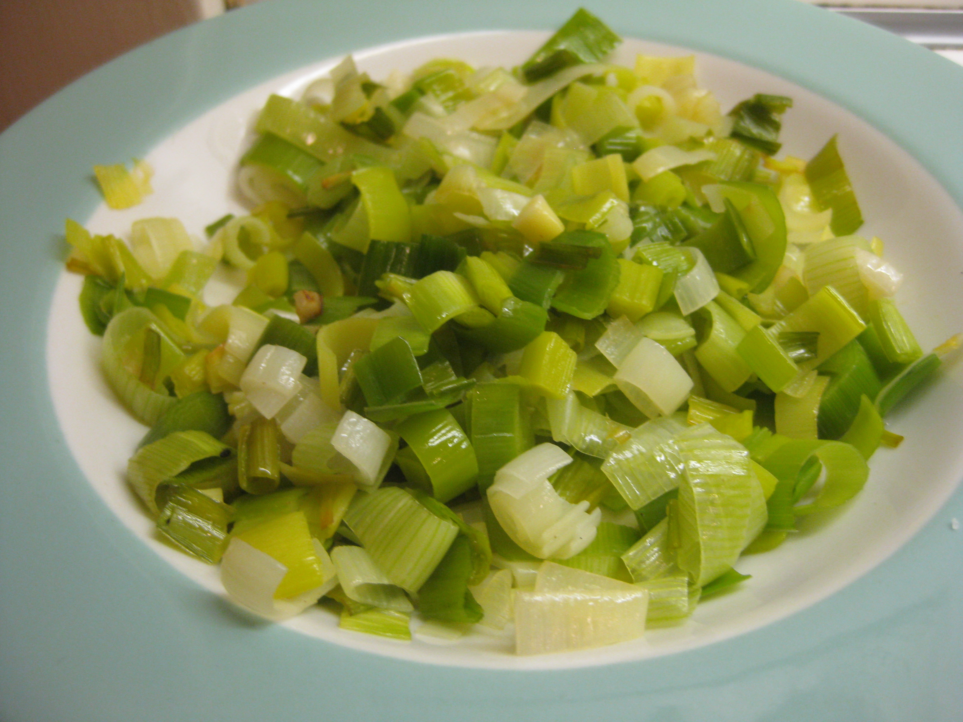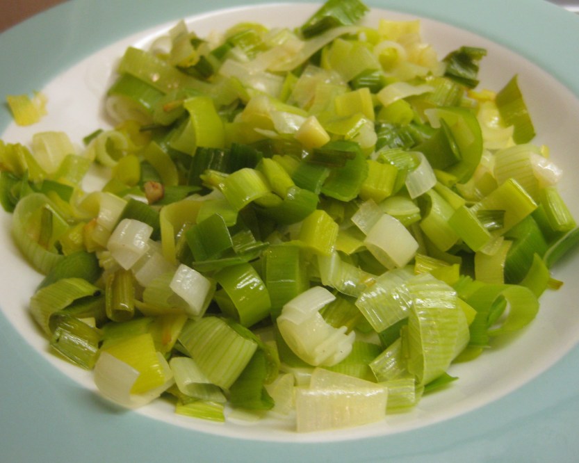The leeks were cleaned after being sliced vertically (helps find the sand) and cooked slowly in a covered pan with a little salt. Oil or butter can be added but are not necessary.