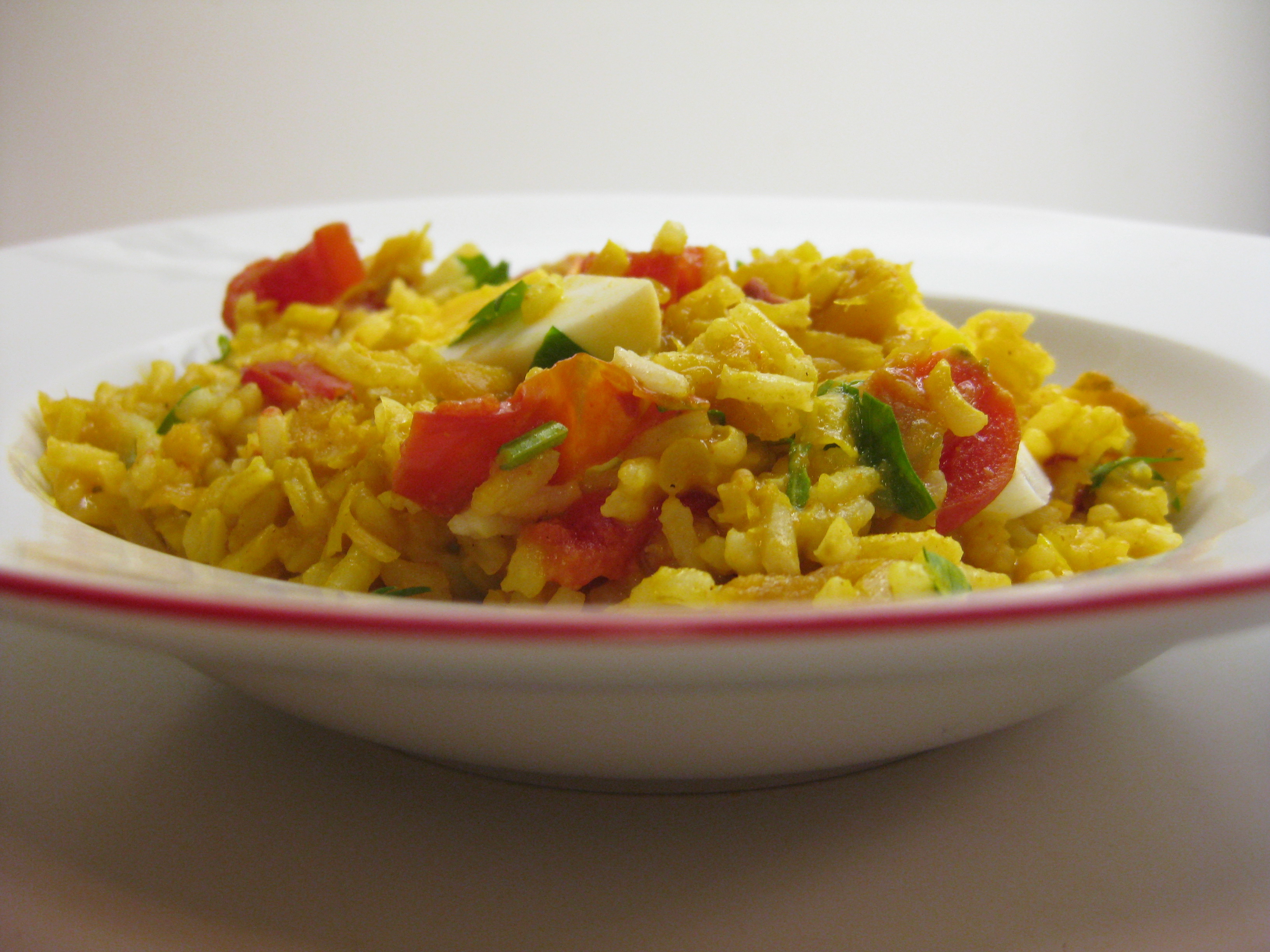 Kedgeree was invented somewhere along an axis between colonial India and Scotland. It combines curried rice with either finnan haddie or salmon. Finnan haddie is a smoked fish whose name is a warp of Findon haddock, Findon being a town in Scotland near Aberdeen. Kedgeree is a warp on the name for an Indian dish called kitcheri, which traditionally mixed curried lentils and rice. In Victorian times, kedgeree was part of a typical breakfast spread. The first time I encountered it was at the breakfast buffet in a Scottish country inn when I was a kid visiting my aunt and uncle and took a road trip across Scotland from Glasgow to Edinburgh. That and kippered herring and some godawful concoction involving organ meat. What an impression on a young palate. Especially at breakfast.
