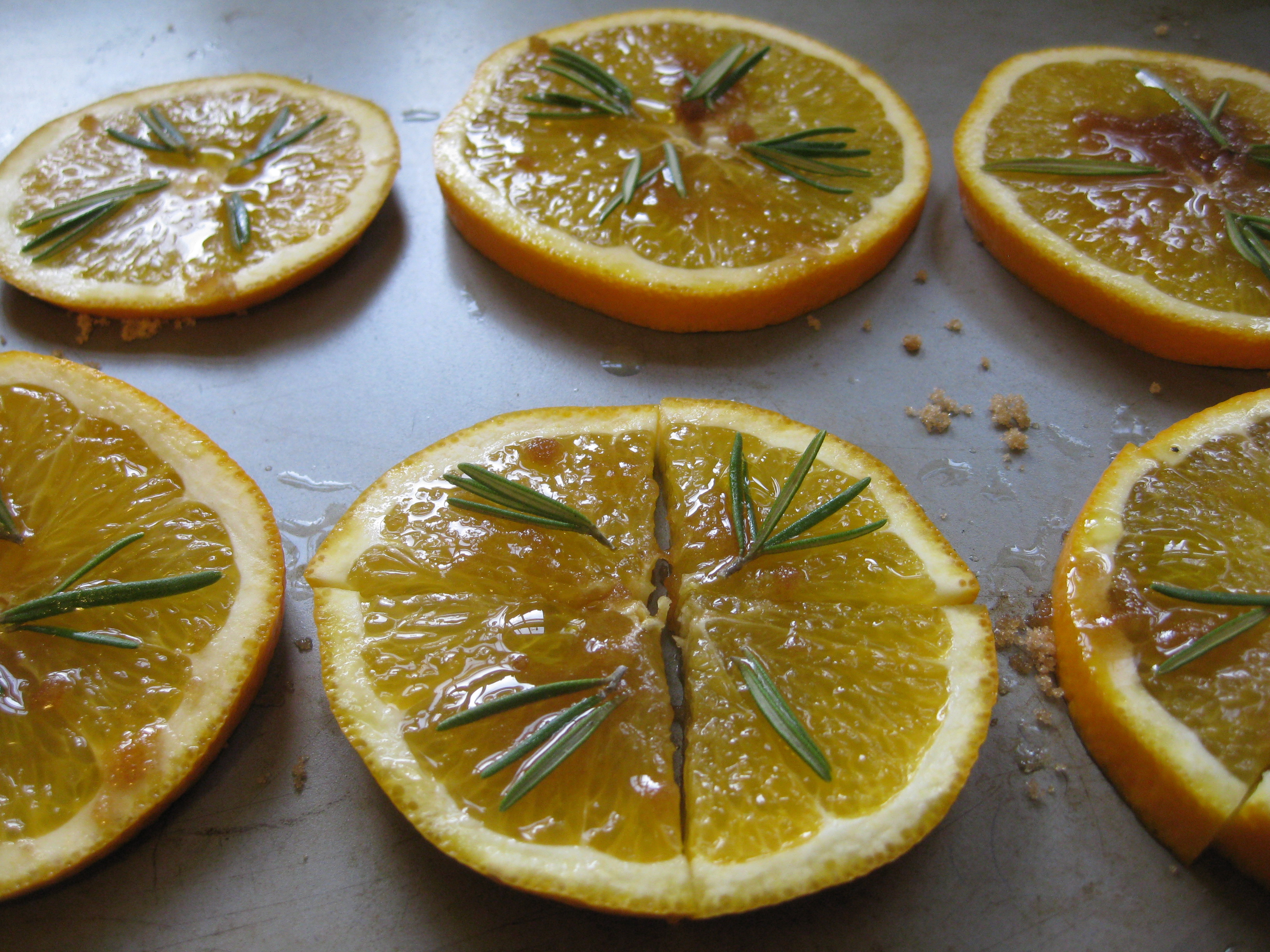 Preheat the oven to 400 degrees. Slice the oranges, unpeeled, in very thin slices (1/8 inch or 3/16). Place the slices – whole or quartered — on a non-reactive baking sheet (if using aluminum, put down parchment paper.) Sprinkle with sugar, place rosemary on top and sprinkle with olive oil. Bake for 10 minutes. The bottom will carmelize. (You could put the rosemary on the bottom, but be sure it doesn’t stick to the pan.) Remove to a rack to cool. Chop up for use in salads and other dishes. Store in an airtight container.