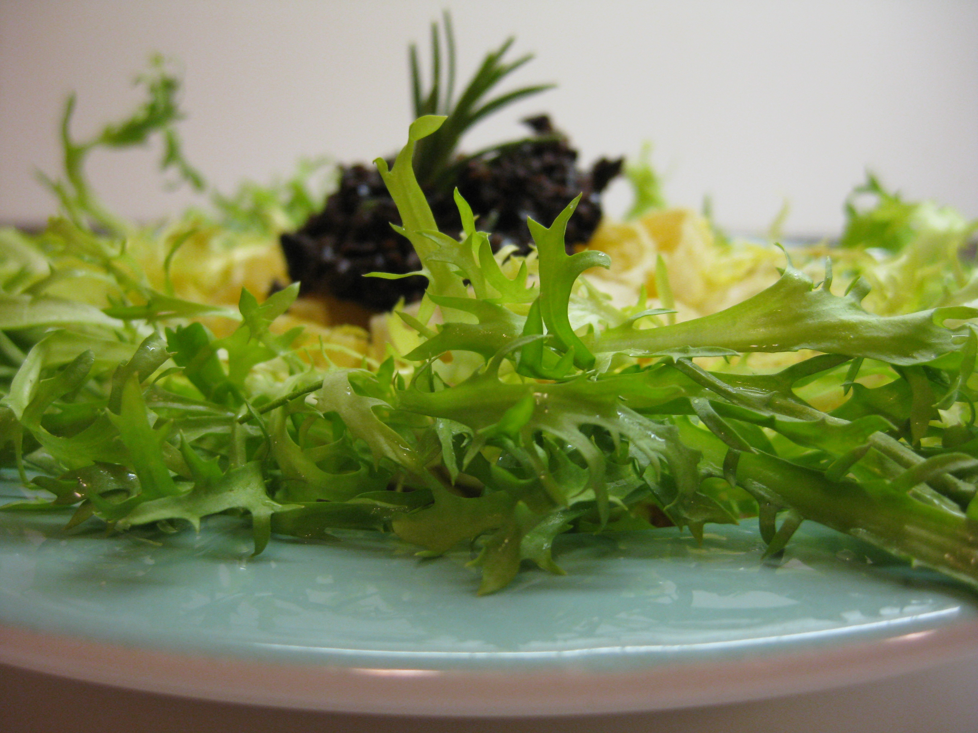 A second salad, with fresh oranges peeled and sliced crosswise in quarters topping a bed of slightly bitter frisee, was accompanied by a black olive tapenade, another inspiration from Mark Bittman (also with a video).