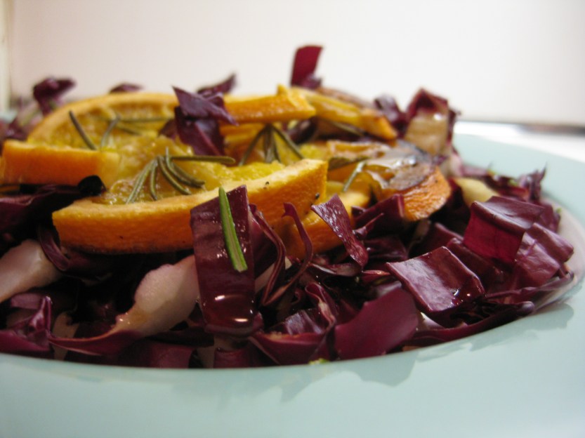 Lately, I have also been experimenting with roasting oranges, which I think are terrific with rosemary. A couple of weeks ago, I combined roasted oranges and beets with pasta. This time, I roasted the oranges with rosemary and combined them with a salad of treviso (an elongated version of radicchio) that I harvested at our CSA.
