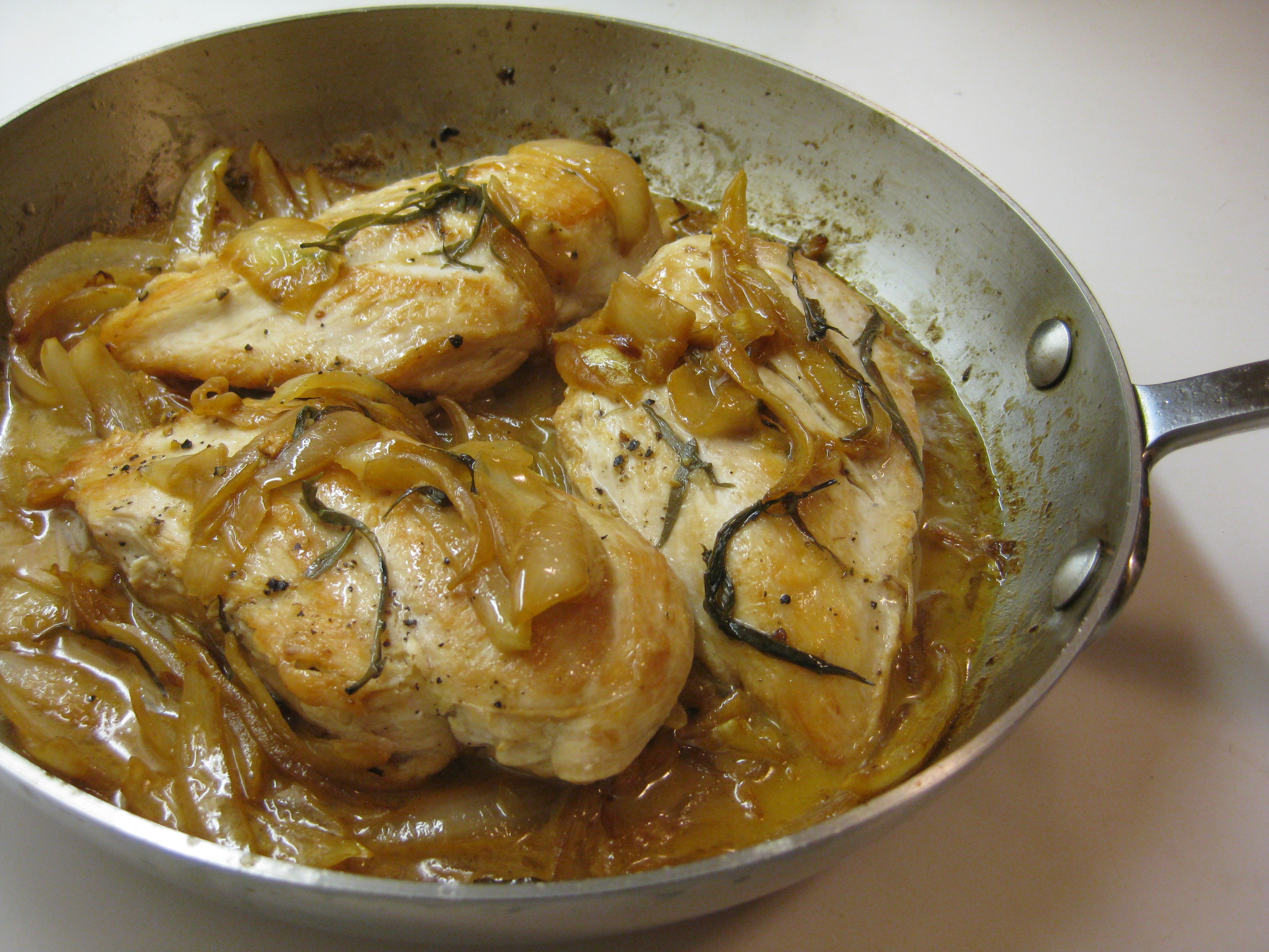 The method is terrific since it creates a flavorful sauce by infusing the onions with the tarragon. After browning the chicken or vegetables in a little homemade butter and setting them aside, you slowly cook the onions in the same pan. When translucent, turn up the heat, add the vinegar to deglaze the pan, scraping up the brown bits, and cook until the vinegar has evaporated. Turn down the heat, return the vegetables or chicken to the pan and add a little cream and some sprigs of preserved tarragon. Cover and braise on low heat until cooked through, 20-30 minutes. The cooking time for the vegetables could vary significantly depending on how young they are and how completely they are cooked in the first stage. I served the chicken with cubed steamed potatoes but noodles would be good too.