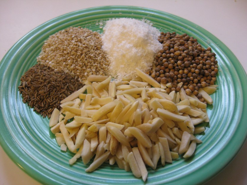 Wipe out the sauté pan and add the coriander and cumin seeds, toasting them over medium heat until fragrant (about 2 minutes). Remove to a spice grinder, let cool and then grind them, adding them to the almond mixture.