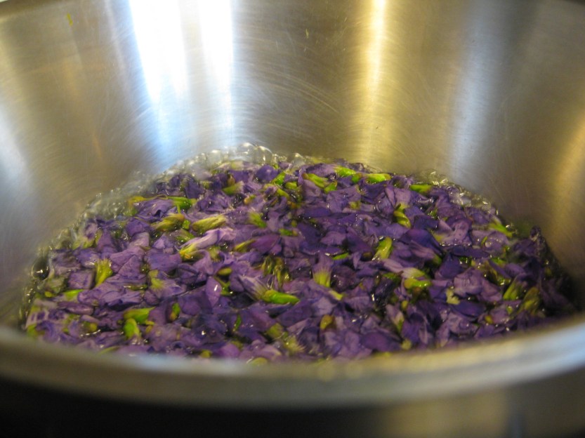 Shake the flowers gently in a colander to remove small particles of dirt and gently mist them to clean. Place the flowers and water in a saucepan and bring just to a boil. Lower the heat to medium and simmer for 10 minutes to release the color and flavor into the liquid. Drain the liquid, pressing down on the flowers to get the last drops.