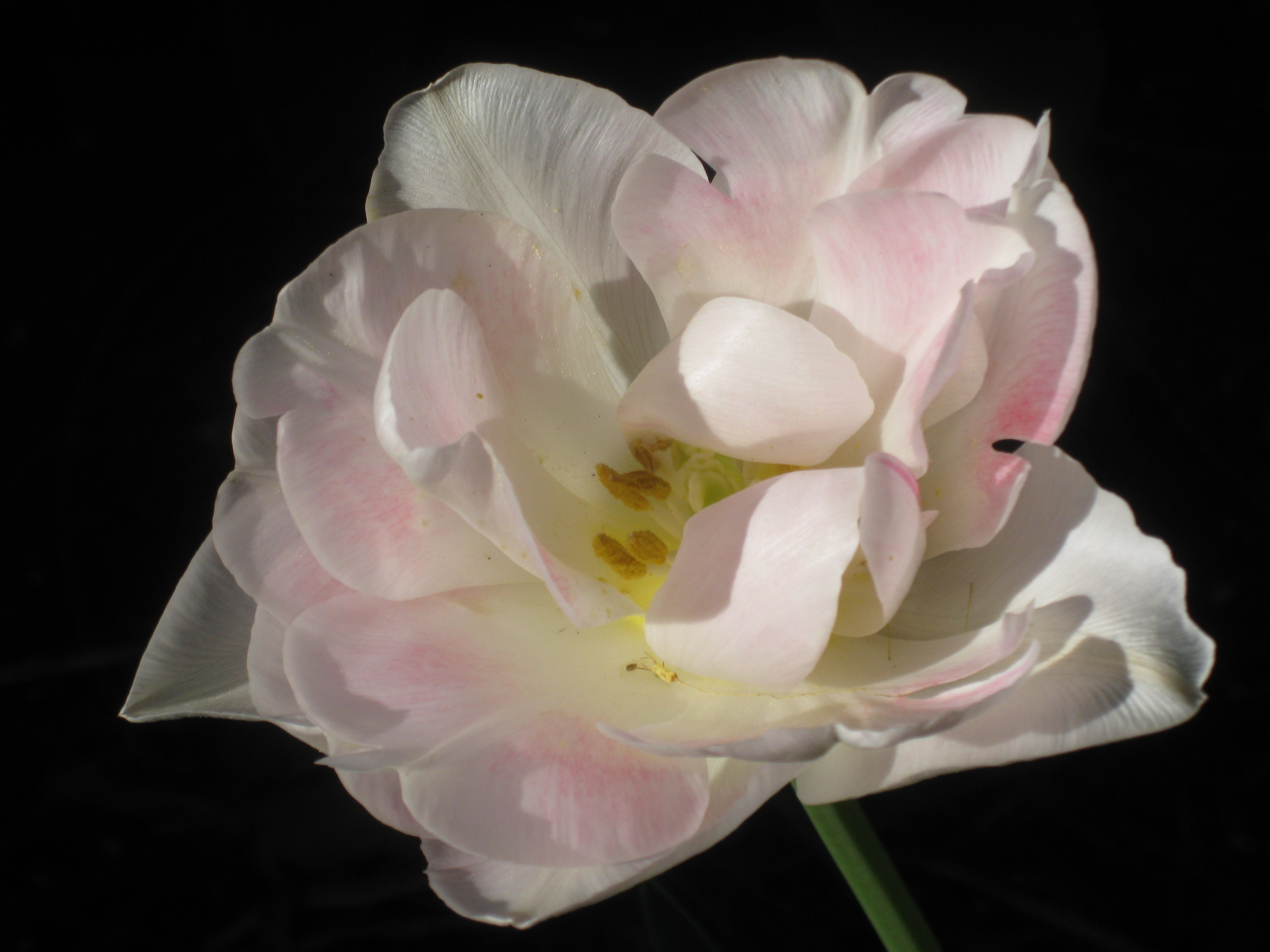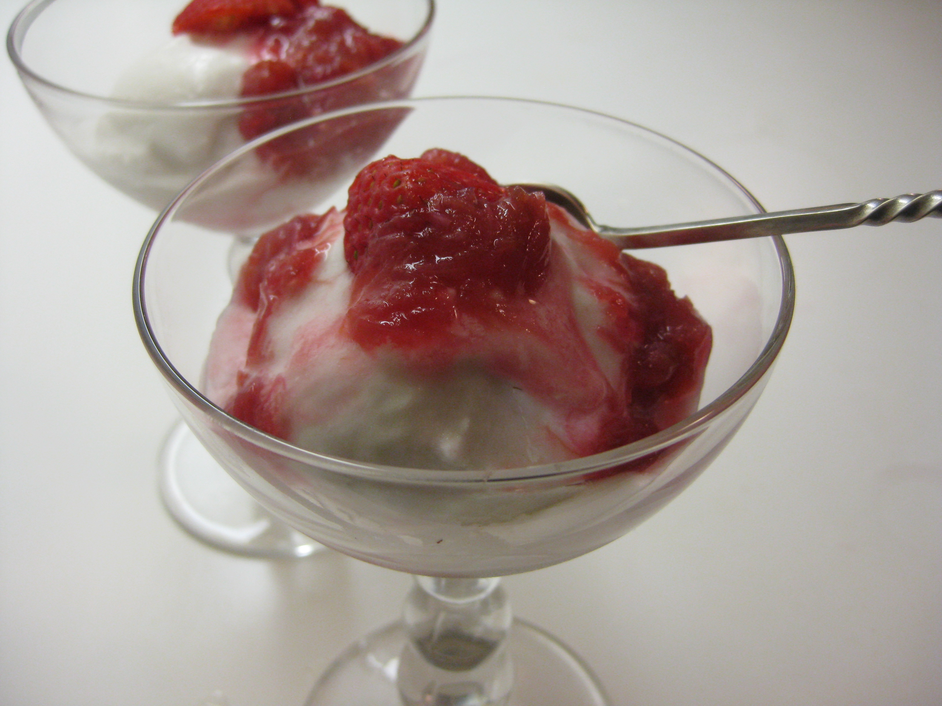Preparing a last minute meal late on a Sunday night after a gorgeous day in a garden full of Angelique tulips was a pleasure. Especially after a great Saturday at the farmer’s market where there was an abundance of asparagus, green garlic, leeks and ramps, spinach, and rhubarb. For Mother’s Day dessert, I made an expedited coconut sorbet with rhubarb sauce and strawberries on top. In retrospect I could have folded the rhubarb into the sorbet. Next time. I could also have made little ginger cookies to go along with this. Another day. This quick dessert was just perfect to cap off an enjoyable evening with my family. I’m a happy mom.