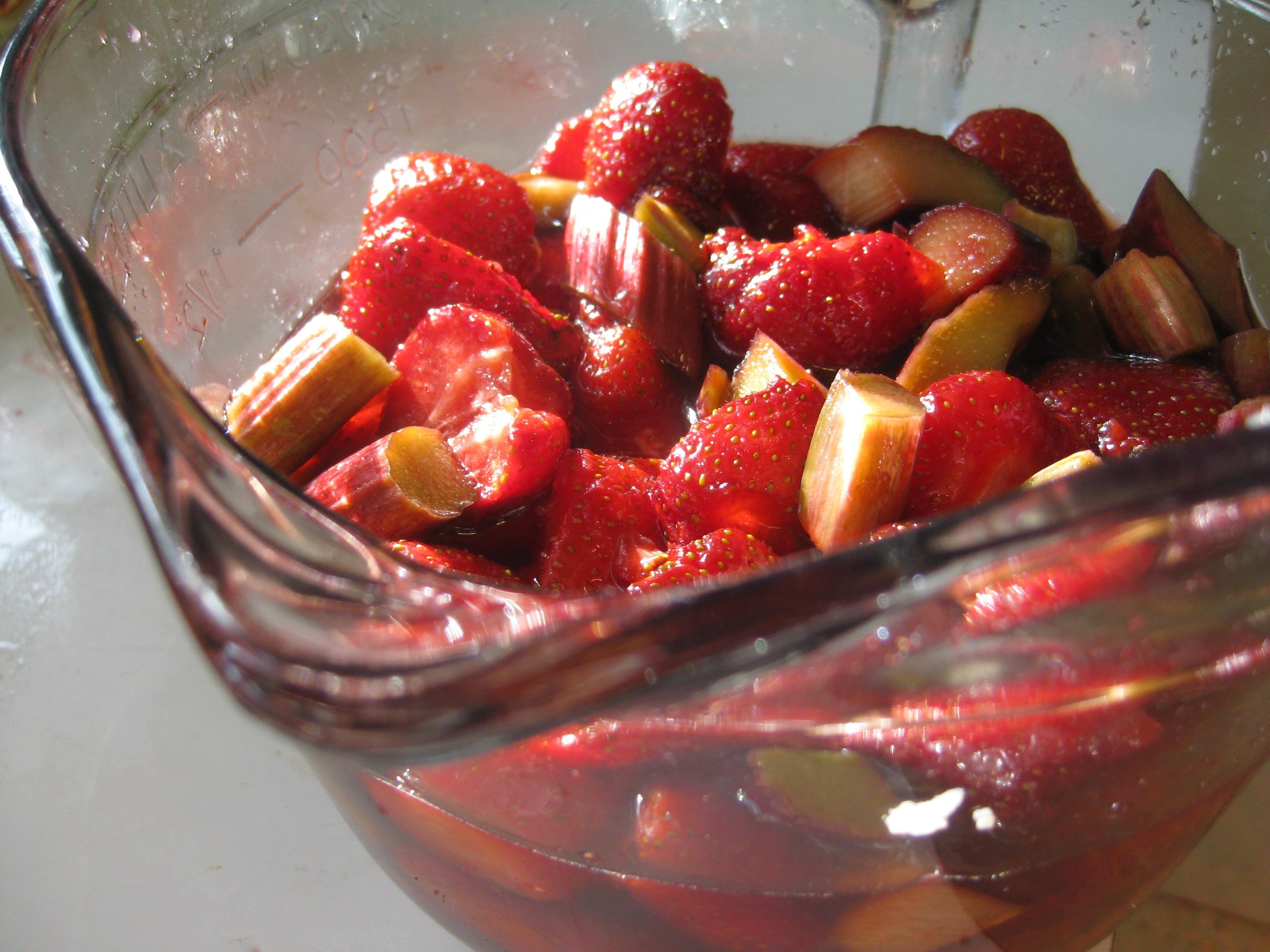Clean and hull the strawberries. Clean and dice the rhubarb into ½-inch pieces. Layer both with sugar a glass bowl, adding the lemon juice along the way. Cover and let sit for 6 hours.