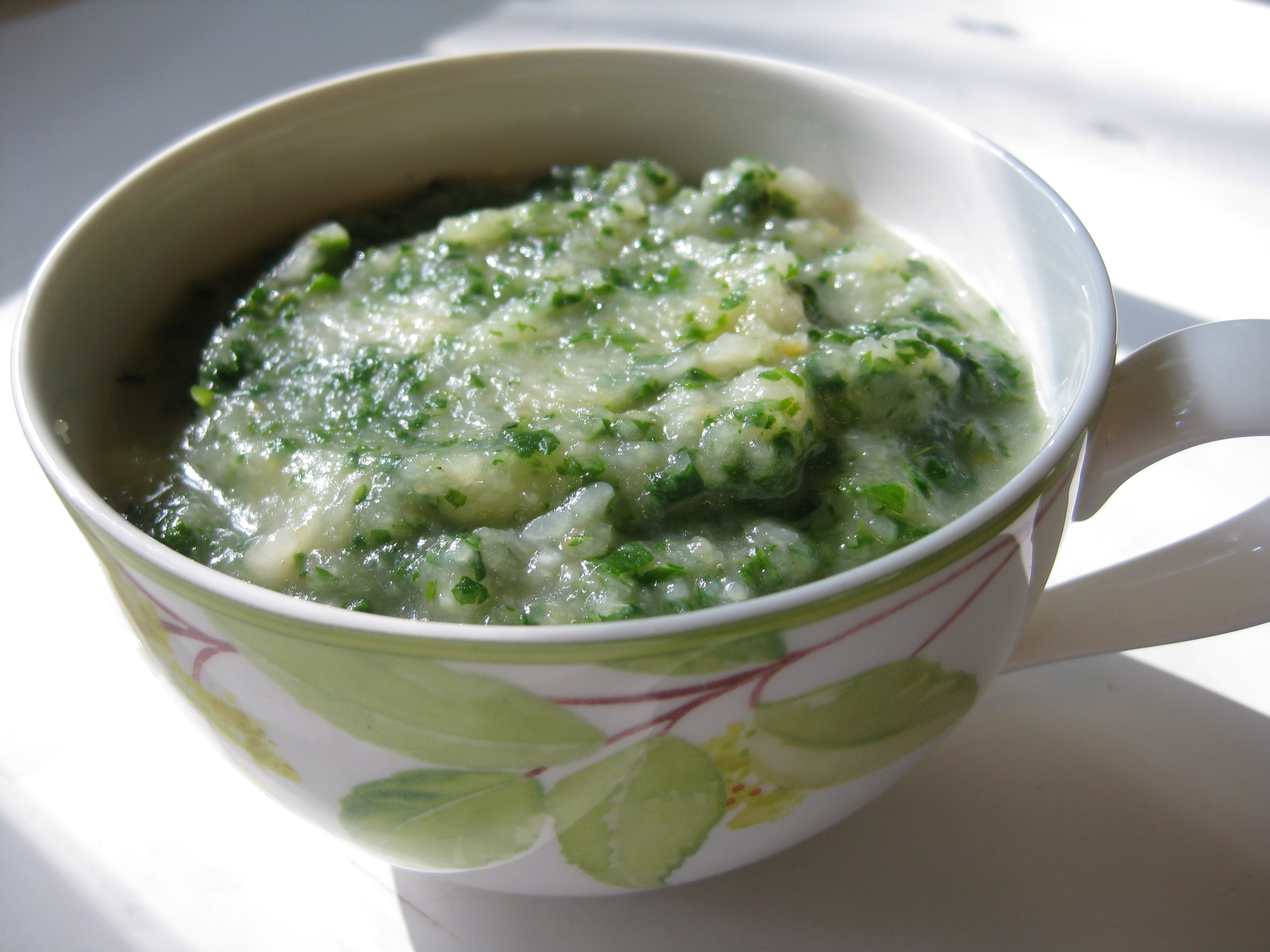 Braise the turnip and potato in butter (or substitute) and lightly salted water to come about 1/3 of the way up the depth of the vegetables. When the turnip is tender, add the stock or broth and the spinach and bring to a simmer. Cook for about 5 minutes. If using farina, add it with the spinach. Puree in a food processor. Add the cream if using and serve hot. Makes 3-4 servings.