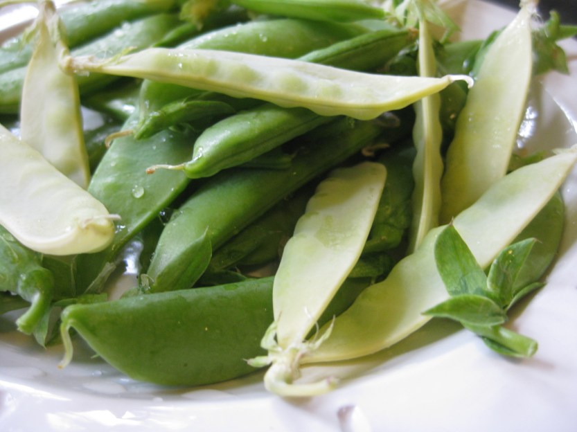 This is my first serving of peas from our garden and CSA. I grow delicate Indian yellow peas in my own garden, along with pale green snap peas. I also pick snow peas and snap peas at our CSA and English (shelling) peas at a nearby farm. These will be steamed with lettuce leaves and served simply with a little olive oil and salt.