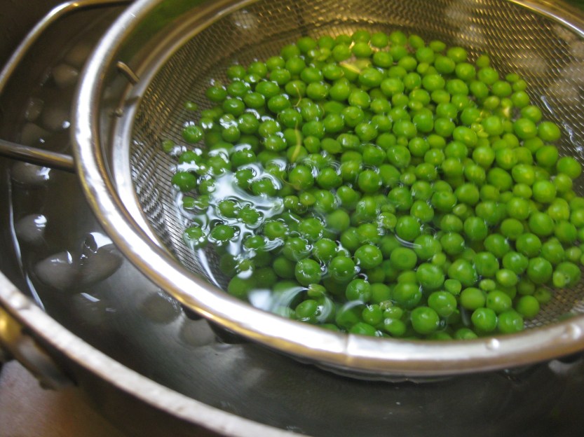 Prepare a pot full of ice water. Bring the broth to a boil and add the peas. As soon as they float and the liquid starts to boil, remove the peas to a colander and plunge it into the ice water to stop the peas from cooking.