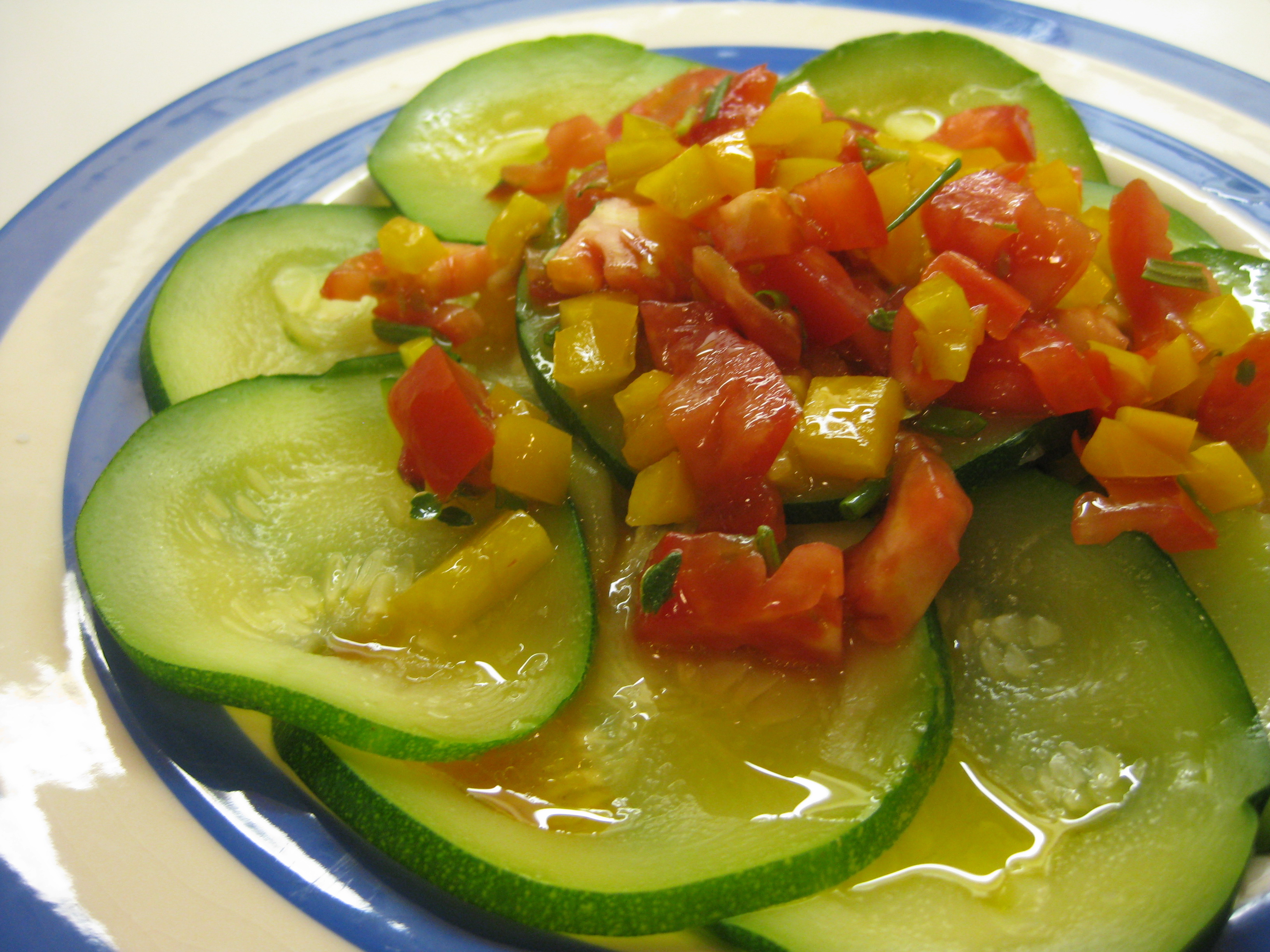 The freshest zucchini deserves the simplest treatment: lightly steamed and sprinkled with a little olive oil and possibly some lemon juice or light vinegar. Here, I topped the disks with a compote of diced peppers and tomatoes with snipped herbs in a light vinaigrette.