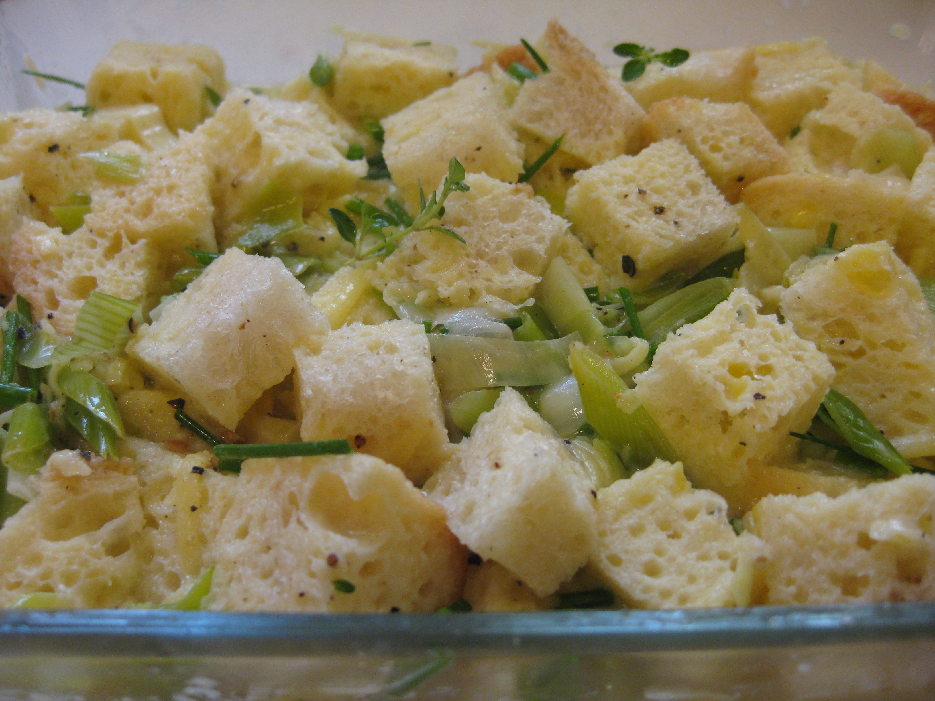 Combine the allium mixture with the bread cubes, add the thyme and chives, and place in the baking dish.