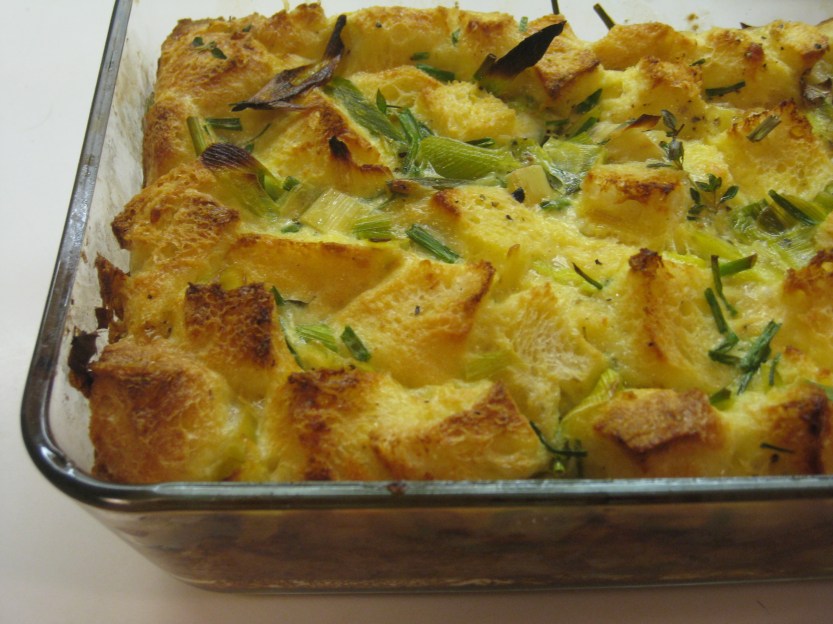 Bread pudding is pretty flexible. I adjust the egg and mil mixture depending on the volume of bread and the wetness of the ingredients. Here I wanted more custard than in other similar recipes, so I increased the liquid and eggs. I could also have added cheese but I wanted the delicate flavor of the allliums to shine through. Note that bread pudding can be made the day before you’re serving it, and then popped in the oven for a little extra time since it will start out cold.