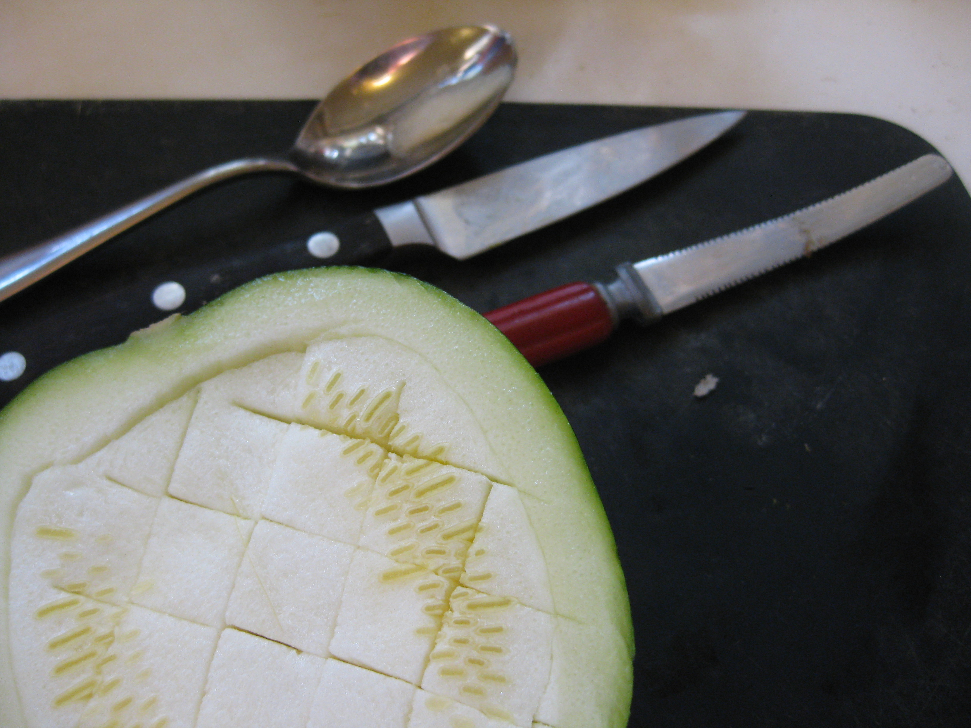 I cut them in half through the stem end and use a grapefruit knife to cut a ring around the perimeter, leaving the shell about ¼-inch thick. By scoring the center section, the flesh can be scooped out with a spoon. I then pre-cook the shell until slightly softened but still holding its shape. I also drain the center or pat it dry to avoid its exuding too much moisture into the filling. Pre-cooking can be done cut side down in a microwave, steamer on top of the stove or in the oven at 325 degrees. It should take 5-7 minutes max.