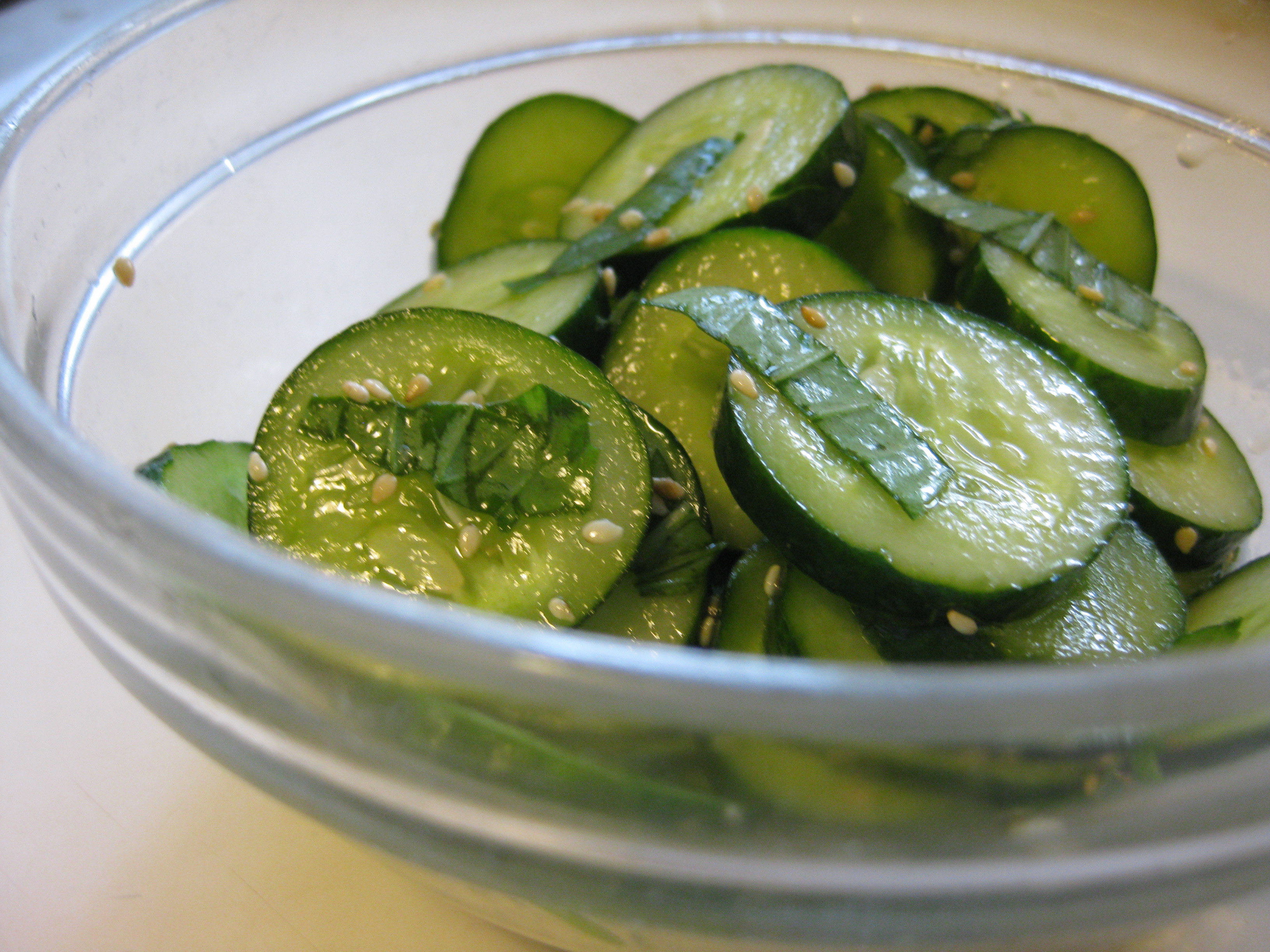 Another salad uses Taiwan cucumbers, cut into chunks, dressed in an Asian-inspired mix of rice vinegar and sesame oil, and garnished with toasted sesame seeds and shreds of Thai basil. Taiwan cucumbers, as they are called at our local farmers’ market, are about 6 inches long, not very seedy and medium-skinned. You can buy them in the grocery store under a different name.