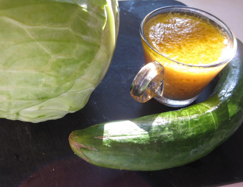 Core and shred the cabbage finely. If using a small cucumber with tender skin, slice it in half lengthwise and cut into half-moon slices. If using a larger cucumber, partially peel it (stripes), remove the seeds and slice finely. Slice the white, light green and a little of the dark green portions of the scallions. Toss with the Miso Lime Dressing and set aside for about ten minutes before serving.