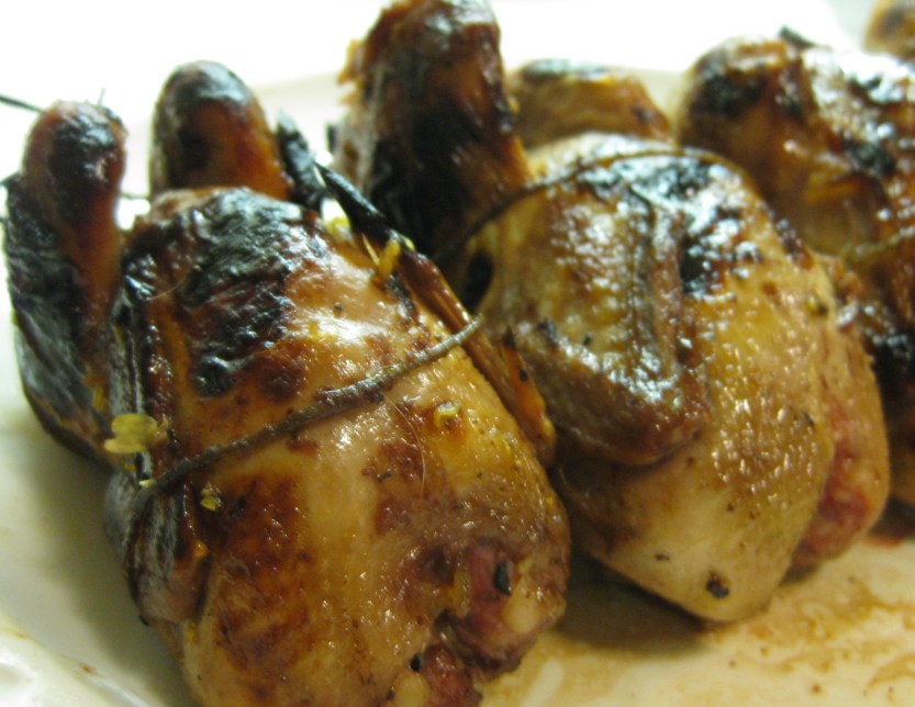 I happen to live near Griggstown Quail Farm, an environmentally friendly producer of poultry that ranges from quail, pheasant and partridge to chicken, duck and turkey. Outside of our community, people would recognize the poultry by the name of its distributor D’Artagnan, also local. According to the website, the 75-acre farm accommodates 70,000 quail, 35,000 pheasants, 150,000 chickens as well as, seasonally, Mallard and Muscovy ducks, turkey and partridge. They’re all grain-fed and allowed to range freely. The processing is supposedly meticulous and happens onsite, a good thing. So for me, with a quick trip to the farm (or farmers’ market), I had four little quail. I prepared a marinade and basting sauce of honey, lime juice and ginger and cooked the little birds over a medium low grill for less than 5 minutes a side or until a tiny cake tester showed the juices running clear. Stay right next to them or they will burn, or petrify.