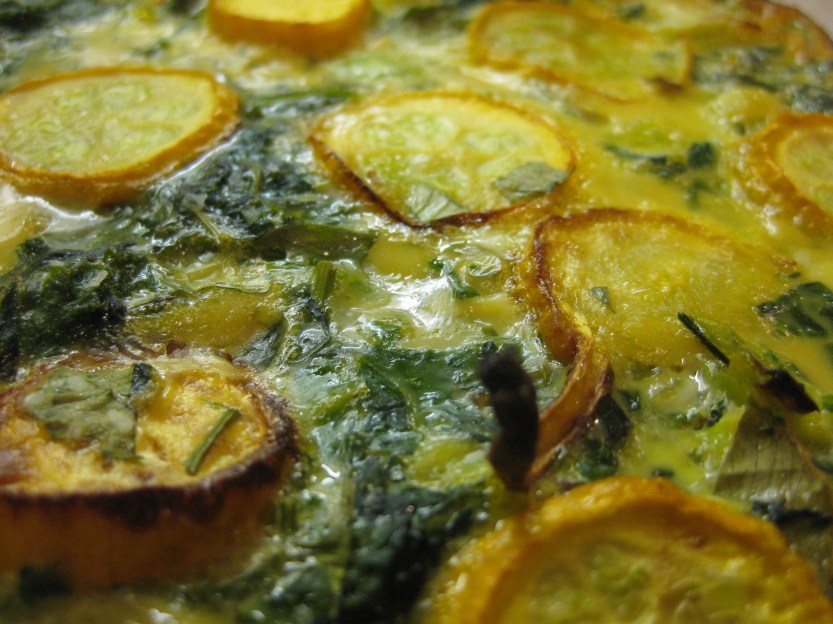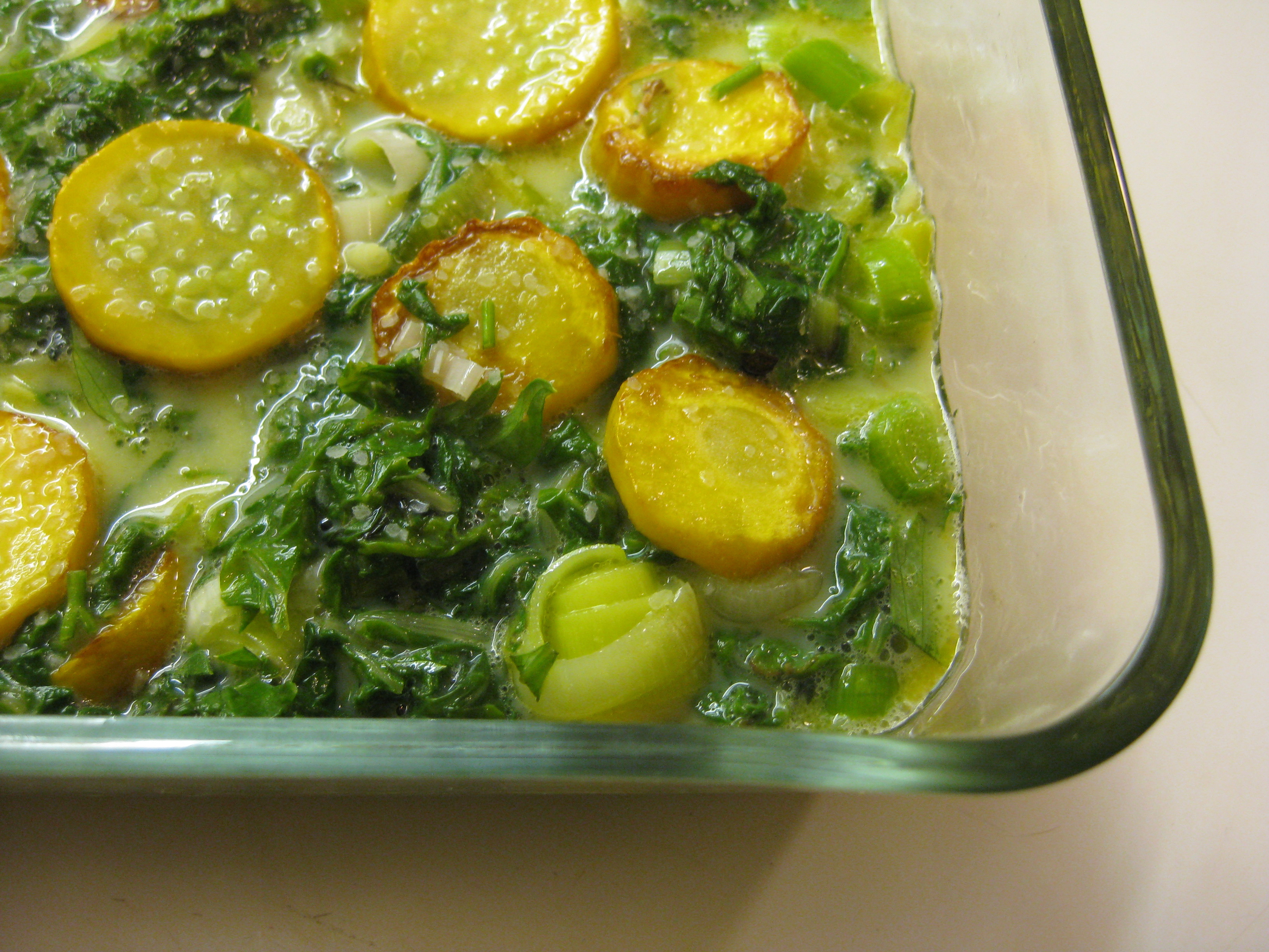 I have a penchant for vegetarian dishes made with eggs, milk and sometimes cheese, as they are nutritious, delicious, pretty quick, and adaptable to whatever you have on hand. For me, this is a technique and not a formula since I use a proportional model. This particular go-round uses non-fat lactose milk with the gorgeous eggs from a local organic farm but cream or regular milk would work. Also, the vegetables could vary widely. And you could add bread or rice to make a more substantial meal. But for me, summertime begs for simplicity …and seasonal flavor.