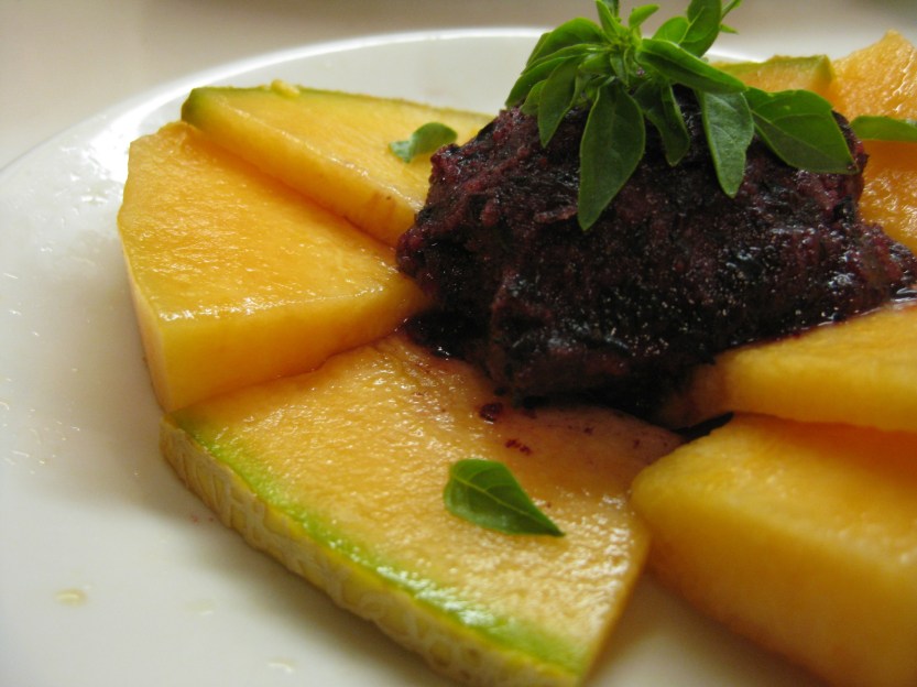Back to the sorbet. I haven’t made blueberry sorbet much, or maybe not even at all, so I googled it and guess what? Up popped a recipe – one of the few ever published — from Gabrielle Carbone, the proprietor of The Bent Spoon, the very shop we visited. She made simple syrup and combined it in a blender with fresh berries. As with the blueberry pie I made for the 4th of July, I wanted the sorbet to convey the freshness of the raw berries, so making the simple syrup seemed like the right idea. It also would allow me a way to steep basil leaves and infuse the sorbet with the herb. I added fresh purple basil to half the finished batch so that I could test which way I liked it. Honestly, we liked both. I particularly liked serving the sorbet with sliced cantaloupe, which complemented the colors, complicated the aromas and taste, and lightened the dessert.