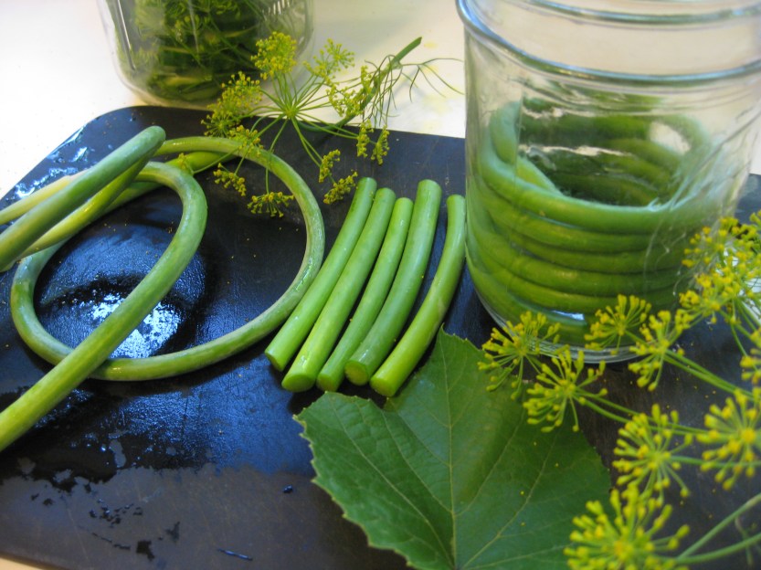 I had accumulated about 40 garlic scapes from our CSA the weekend that I was making sliced cucumber pickles with dill, so I decided to pickle them too. Garlic scapes are the curling flower stalks of hardneck garlic plants and are typically cut off so that the plant’s energy is devoted to making a plump bulb. This type of garlic is actually called Rocambole but is nicknamed “serpentine garlic” for obvious reasons. I cut off the scapes of our garden garlic when they were younger than the ones from our CSA, so they were eaten raw or steamed. These needed a more aggressive treatment to tame them.