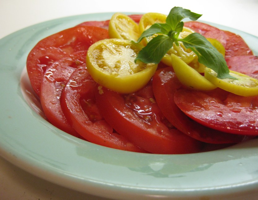 Our local tomatoes start to ripen en masse just as August arrives. I just hauled home 12 pounds of slicing tomatoes and 2 pounds of cherry tomatoes from our CSA. Walking through the fields, I saw bounteous plum tomatoes that will be ready in a month and cherry tomatoes in weeks. Our home garden has transformed from a civil potager to a rampant jungle of tomato and cucumber vines. Luckily, I have about 10 varieties, mostly cherry tomatoes, but unluckily some are rogues that just spouted, signaling a potential disease scenario. My husband groans that the arrival of so many red and yellow orbs will be an unbearable invasion, asking if I would please set up a canning operation in the basement. What? In the basement?