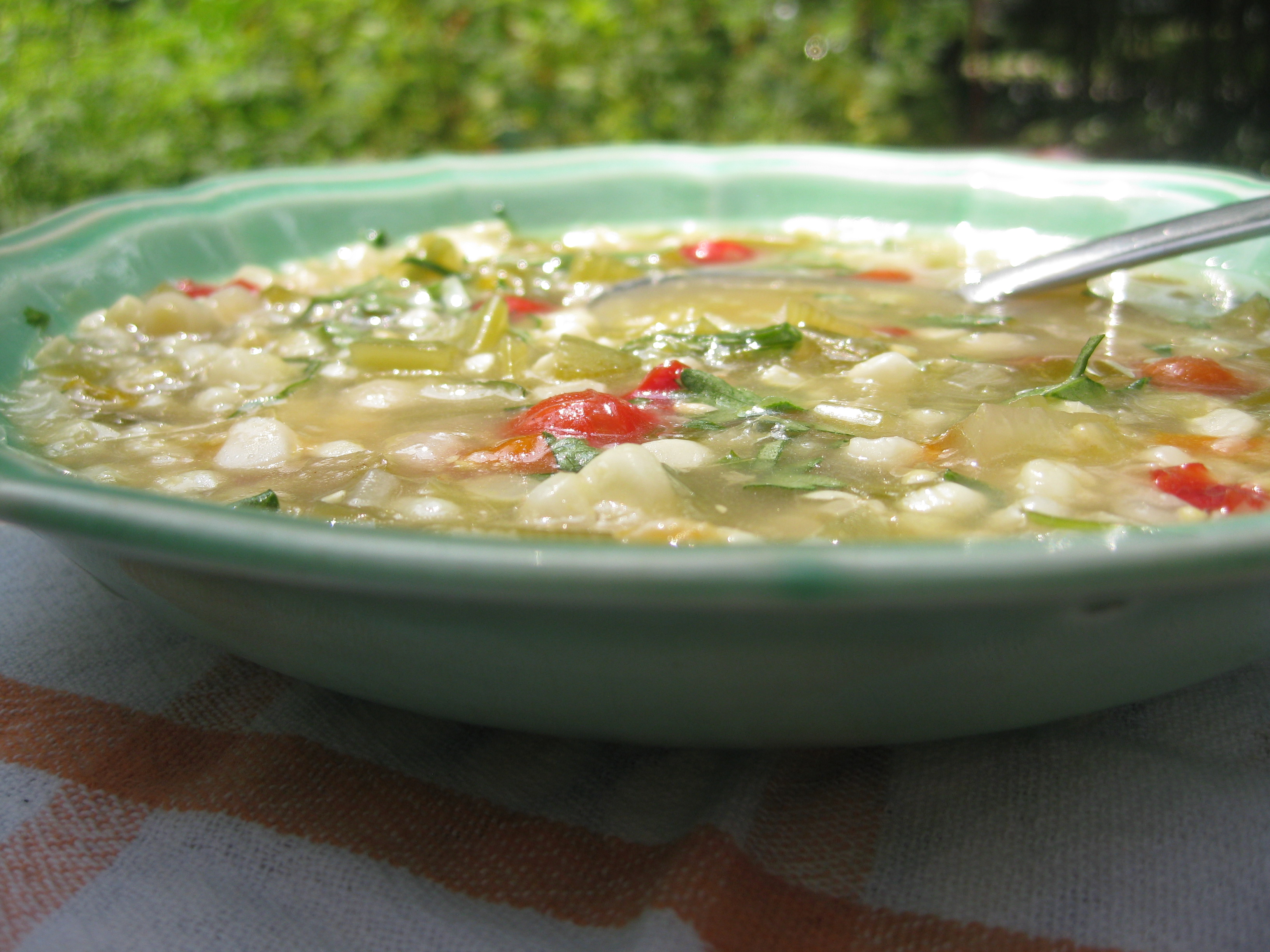 I take a similar approach to food going to the compost pile as I do the trash. I try to waste as little as possible and extract whatever nutritious or useful substance it may have before I toss it. On Friday, I made a corn salad for a picnic and ended up with 2 dozen corncobs. The husks went straight to be ground up for the compost pile, though if I were a purist, some would have been swell for tamales. There was too much good corn residue on the cobs to waste so I covered them with water in a large stock pot, added a little salt, a chopped onion and a handful of celery trimmings, cut to a useful dice. The corn broth reduced at a simmer for an hour or so and I removed the cobs. I brought the liquid back to a boil and cooked it down a little. The result was a sweet and flavorful broth, some of which I turned into a corn soup and the rest of which went into the freezer.