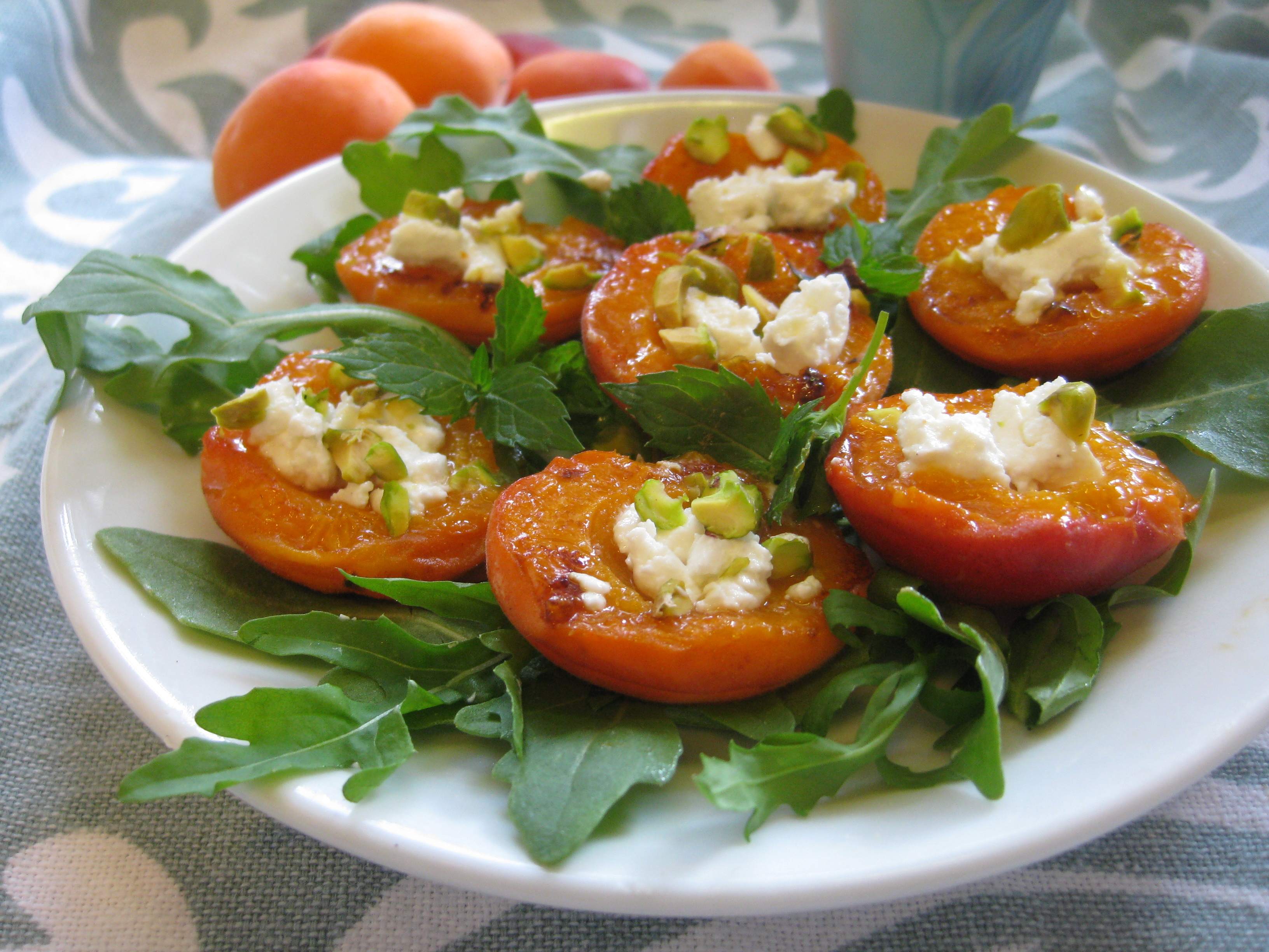 Cut the apricots in half along the seam line (pole to pole). Place them cut side down in a hot frying pan with vegetable oil. Cook for a minute or less and remove to a plate. After the fruit is cool, add a small spoonful of goat cheese to the center, sprinkle chopped nuts on top and serve over mixed arugula and mint leaves. The greens can be dressed with a lemon vinaigrette, but I personally thought they were fine with just the juices coming from the apricots.