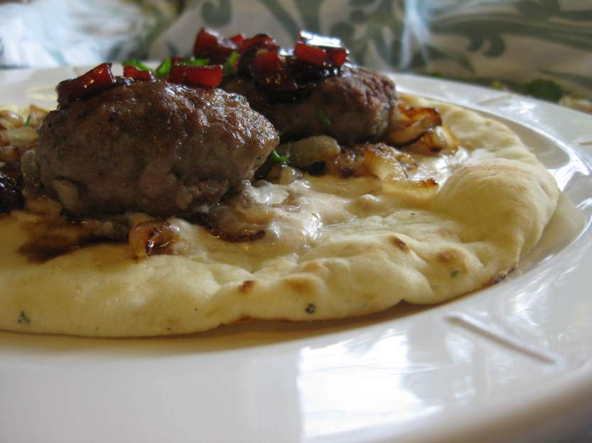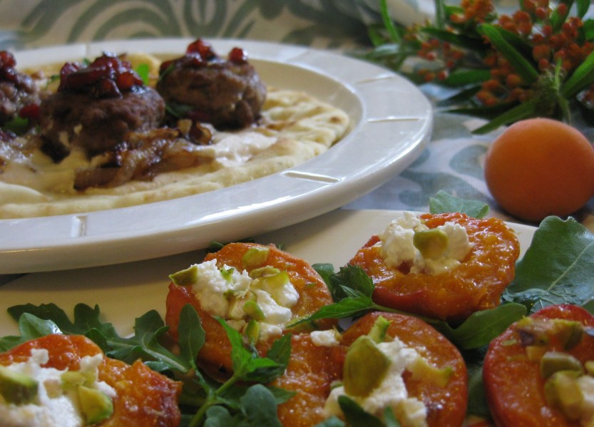 I served lamb meatballs flavored with cumin, Aleppo pepper (Yay A) and mint on flatbread that was coated with yogurt-tahini sauce and caramelized onions, and topped with a relish of red pepper and pomegranate molasses (a simplification of a traditional muhammara, which I thought would be too rich). The side dish was composed of pan-grilled apricots with goat cheese and pistachios served on top of chopped mint and arugula (another A word). Delicious.