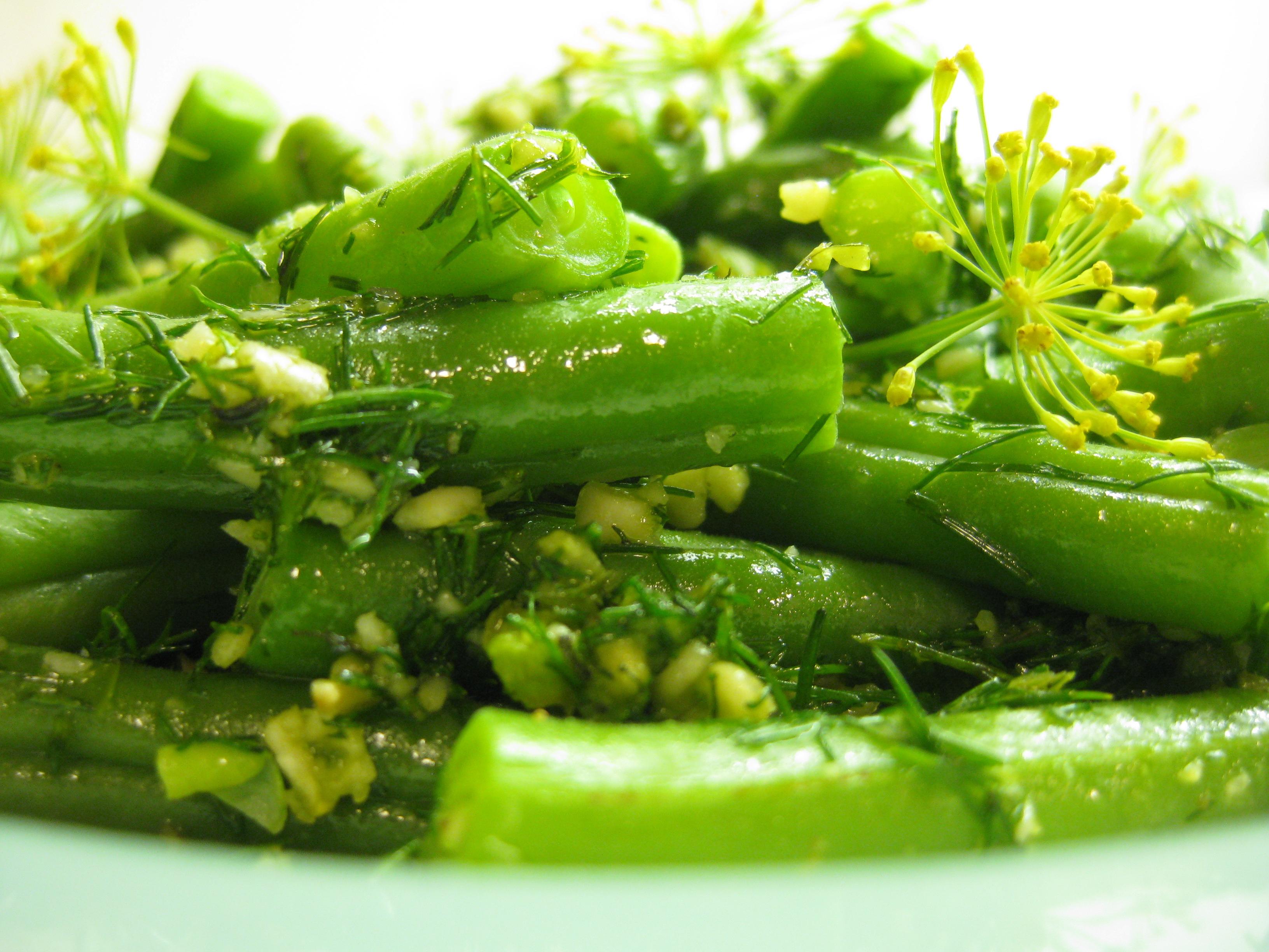 Dill pesto is made in a similar manner to basil pesto: chop (in a food processor) dill fronds with a tiny bit of garlic (optional), a healthy pinch of salt, pine nuts or walnuts, and a little olive oil. To retain bright green color, toss the pesto into cool beans.