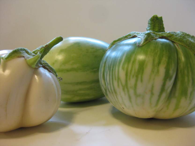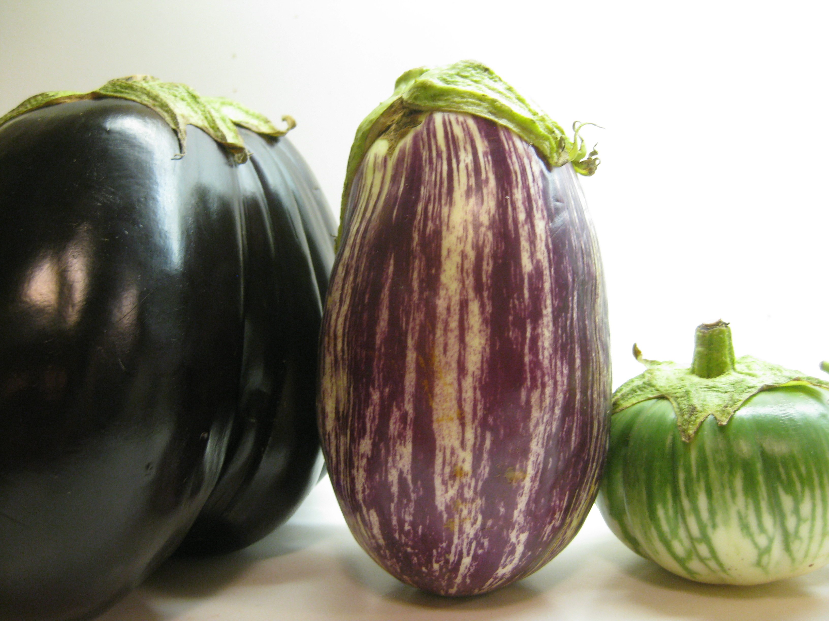 There are big pleated dark violet ones, skinny little green ones, smooth bright violet ovals, striated versions in many shapes. So far, I’ve counted over a dozen types. Gorgeous. They’ll be grilled, roasted, steamed and fried, stuffed many ways, preserved in oil, and turned into ratatouille, moussaka, and lasagna, at the least. They’ll cut across Mediterranean, Middle East and Asian cuisines.
