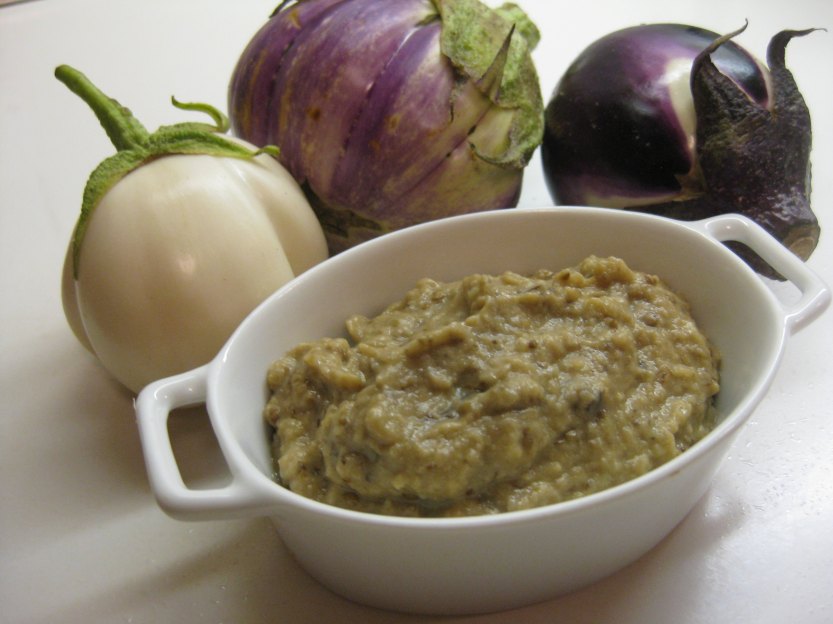 In the Middle East, there is a tradition of meze, small dishes that precede a meal or, like the Spanish tapas, constitute a meal. One of the most prevalent dishes is an eggplant puree called moutabel, sometimes referred to as baba ghanoush, although I understand they’re not exactly the same. I frequently roast a whole eggplant in the oven alongside something else or place it on a grill to use the heat from the dying coals, and let it char and collapse in a heap. I do this in the summer and fall when I am overloaded with eggplant from our CSA and also in winter and spring with slightly damaged eggplant sold for pennies a pound at our local organic market.