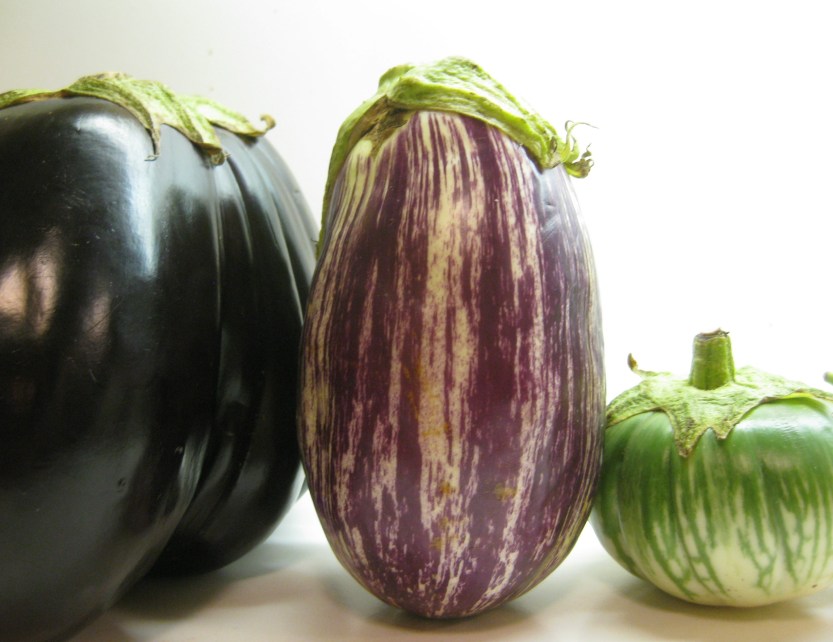 Among the many things I love about our CSA farmers at Honey Brook Organic Farm is the variety of crops they grow and distribute to the members. In the last few weeks – and for the next few – the eggplant crop is yielding so many picturesque choices that it’s hard not to use them as still life compositions – in the same way that we think of flowers — before we turn them into delicious fare.