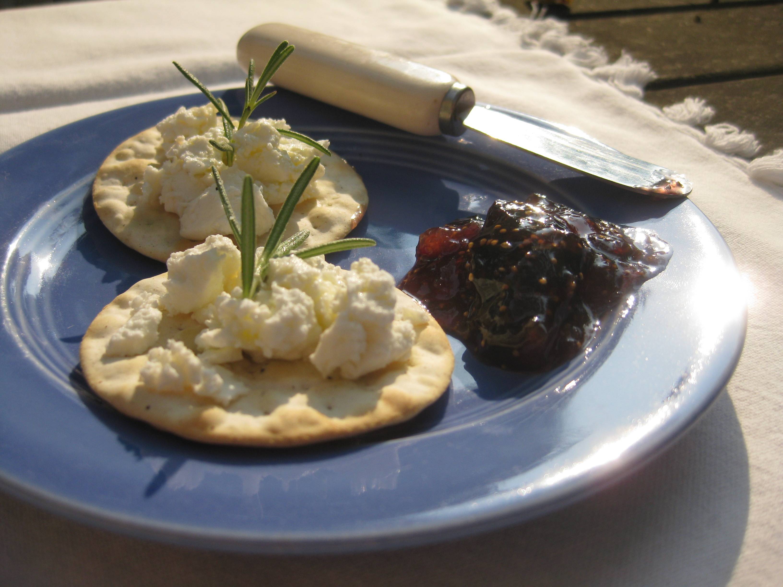 I made a batch of microwaved fig jam (like the orange fig jam I made last year) and while it was delicious, it was a little sweet for my taste. With a second pint of local figs (yes, local), I decided to make a second batch of jam, decreasing the sugar and adding grated lemon and rosemary, both of which did the trick. This is great with goat cheese on crispy crackers topped with a few drops of olive oil and a few rosemary leaves, which by the way is a simple appetizer that seems much more than it is.