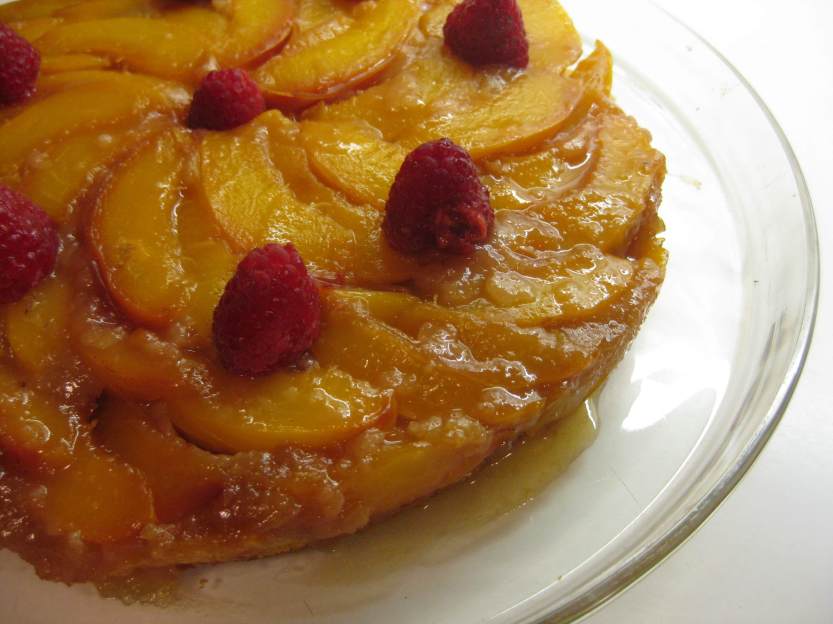With the ingredients nectarines, cornmeal, almonds and green tea for this month’s Paper Chef, I immediately thought of an upside-down cake that I used to make — every summer it seems — but forgot about in the last couple of years. I’ve made it with both plums and nectarines. Nectarines are in full season now, with local orchards and farmers’ markets burgeoning with fruit. It’s all we can do to keep up with the produce these days.