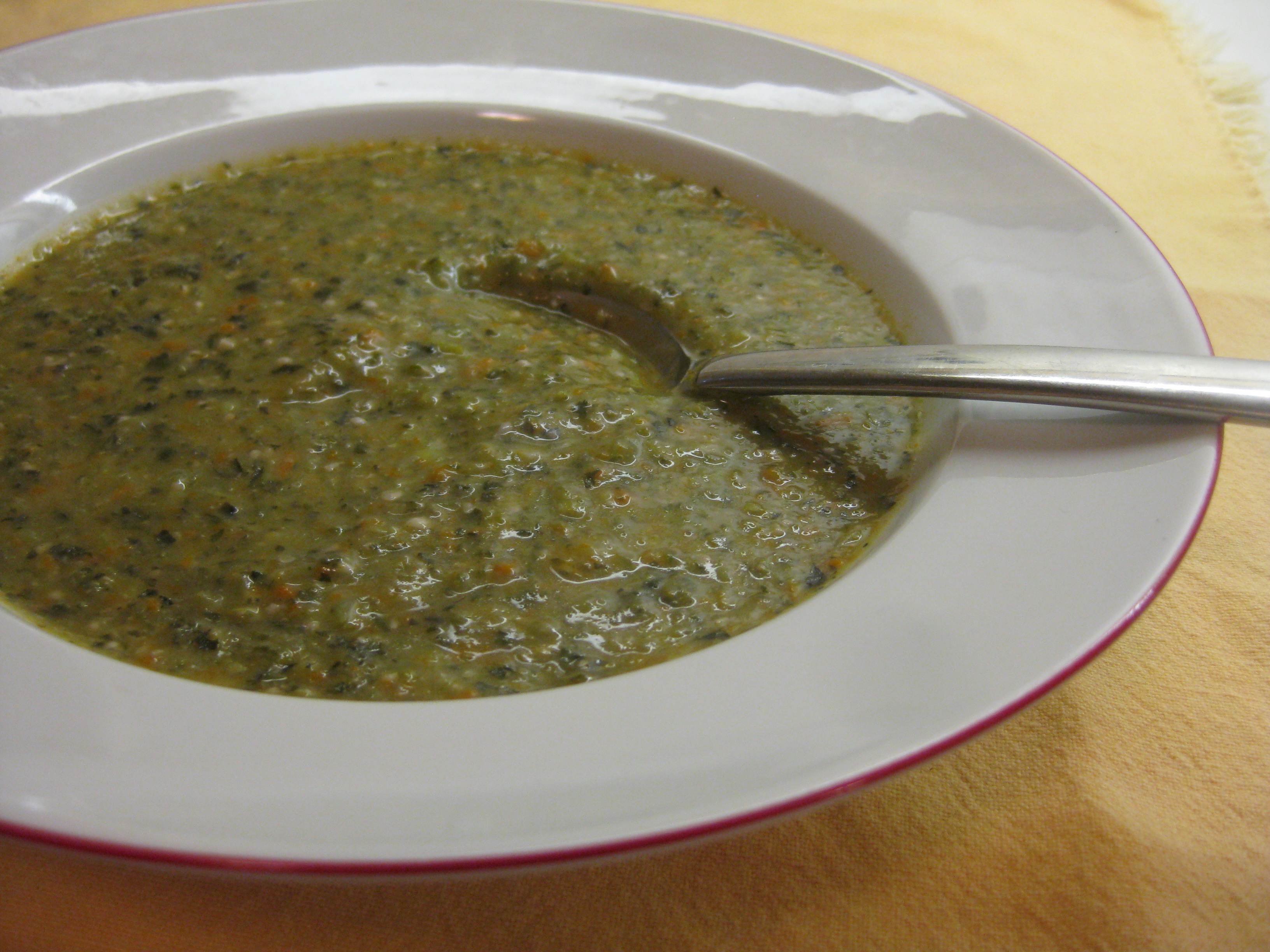 Sometimes you just have to suspend your disbelief. Or maybe just put your trust in a proven source. This silken soup from At Home with Madhur Jaffrey solved the overflow of what I previously thought were random ingredients in my kitchen – okra, green beans and chard. It also produced an alluring, slightly spicy and delicious soup with a combination of flavors that defied identification. In a taste test, I would have been baffled, blindfolded or not. I would have gotten as far as the carrots in the visual test and with some prompting may have picked out green beans in the blind test. I might have suggested eggplant because of the texture and flecks of white seeds.