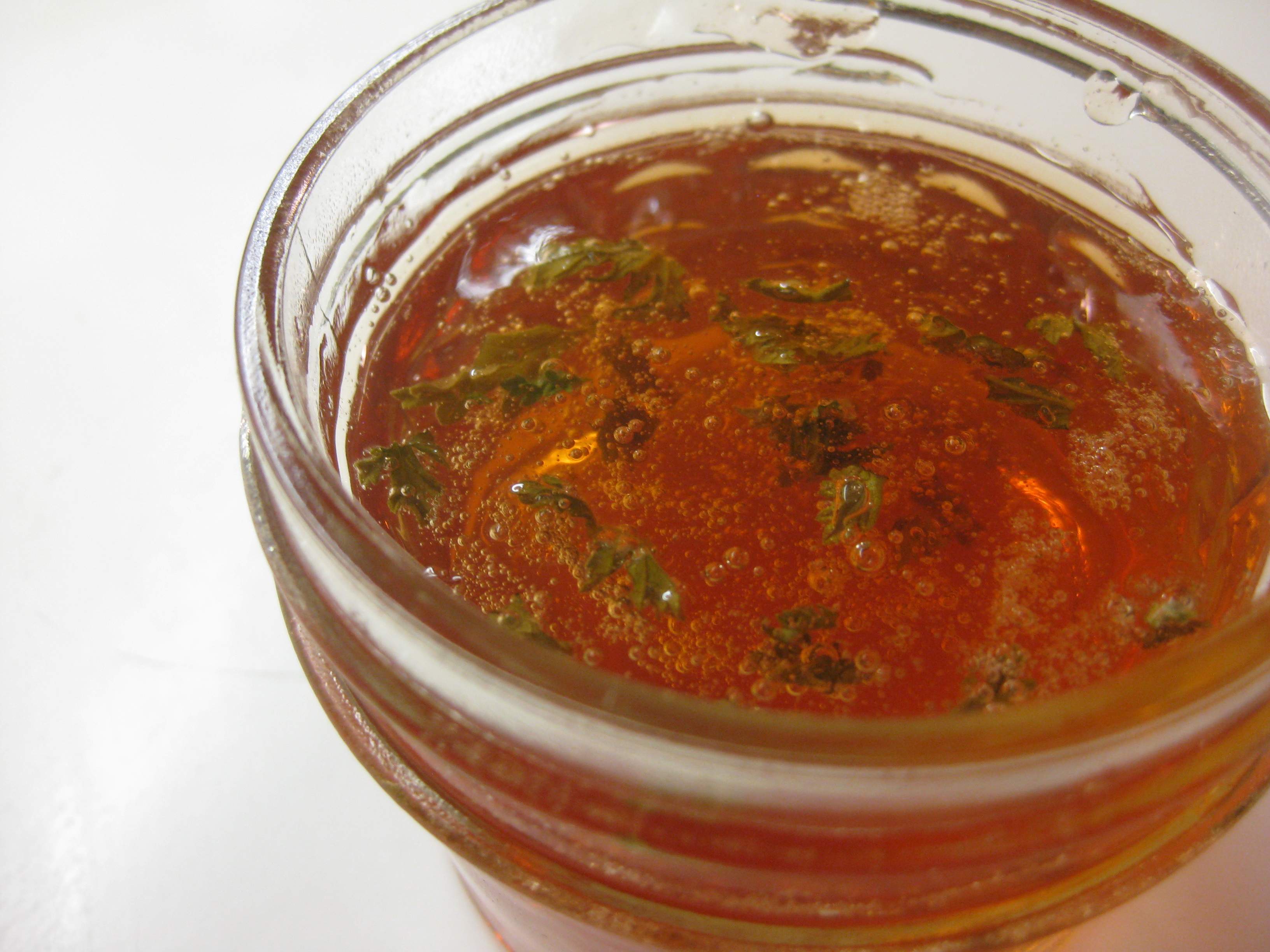 While my flower jellies used powdered pectin (a substance I typically avoid), my herb jellies take advantage of seasonal tart apples for the base. The technique is simple: simmer apples and herbs in water to cover for about 45 minutes, without mashing anything. Pour the mixture into a jelly bag (or cheesecloth-lined sieve) suspended over a bowl to catch the juice and leave it sit overnight. Add ¾ cup of sugar for every cup of liquid and some acid (vinegar or lemon juice) and cook the mixture quickly until it tests for gel, usually about 10 minutes for the small amounts I make. If you are adding little snippets of leaves to the jelly, let the jelly sit in the jars for a few minutes before adding the leaves so that they will be suspended in the ever-gelling liquid. Store in the refrigerator or process in a water bath canner.