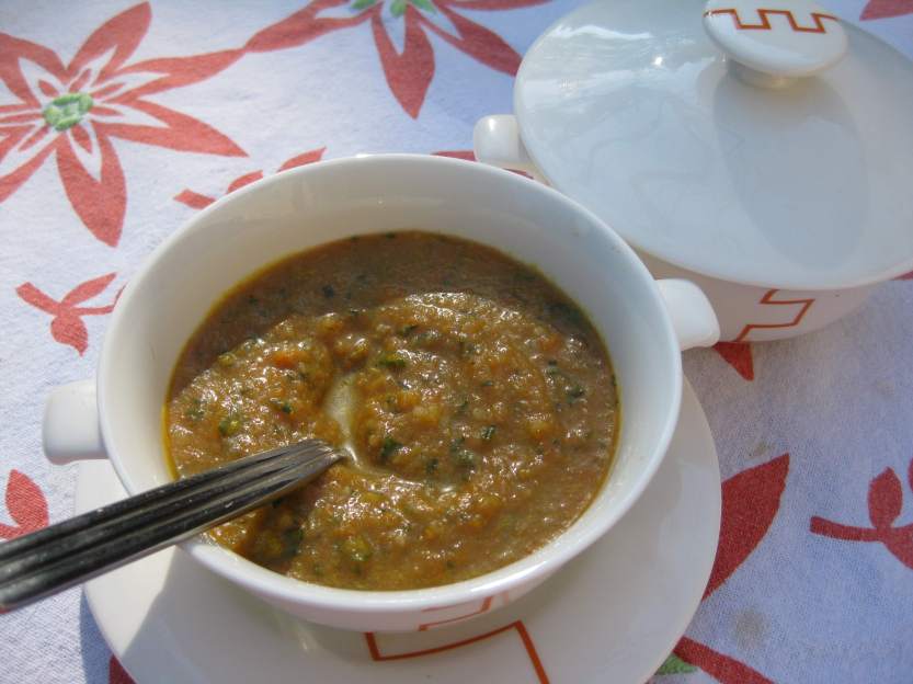 Last year, I also made a delicious celeriac soup that used not only the bulb but also the stalks and leaves, and a carrot soup with its greens. This year, I made a carrot and celeriac soup base that was so thick that I first served it with roast chicken as a puree and then thinned it out into a soup, combined in both cases with pesto made from the leaves. I had first thought to make this a creamed soup but chickened out. The thickness and creaminess were contributed by a couple of small potatoes. You could use water or chicken stock to make the puree or soup, but I used vegetable broth brewed from the trimmings of the ingredients and a few stray veggies.