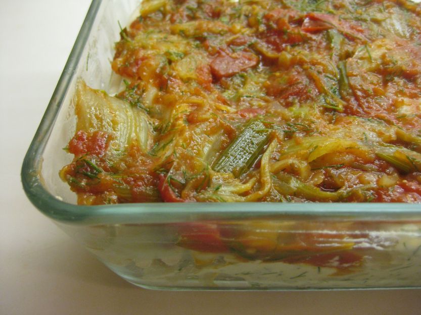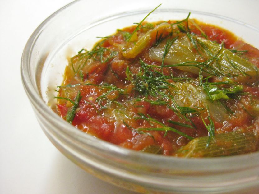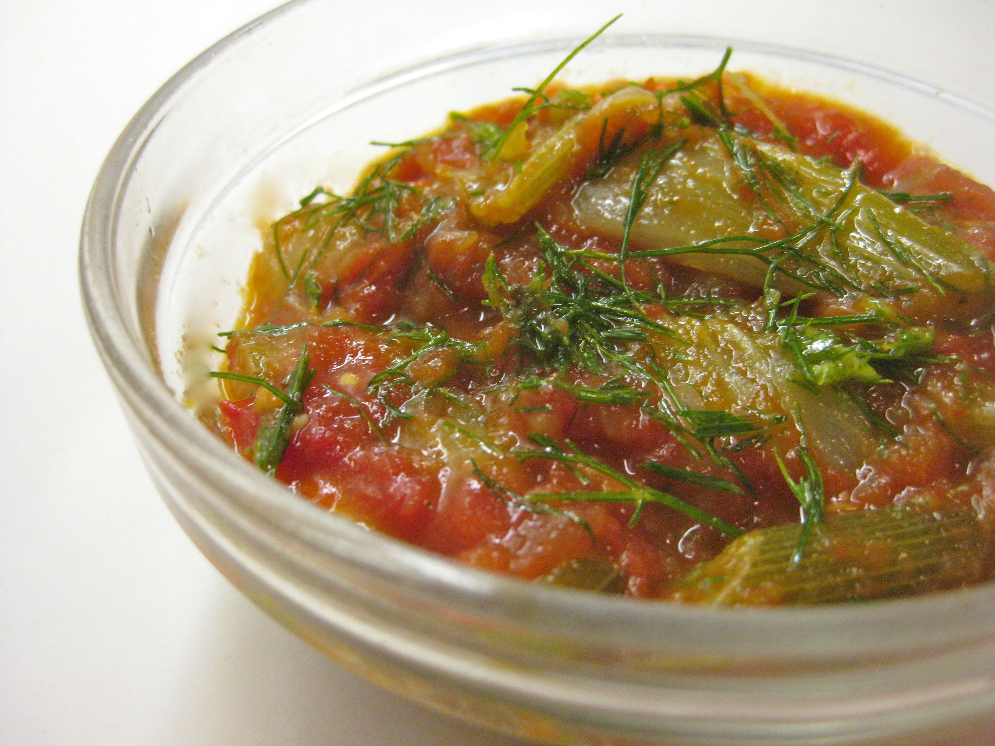 After a weekend of canning tomatoes, including a lovely Provençale-style tomato sauce with orange and rosemary, I had a little leftover sauce, a leftover half of an orange (precious at this time of year) and a large (3-foot-long) bulb of Florence fennel with stalks and fronds intact, courtesy of our CSA farm. I hadn’t figured out our weekday night supper, and this combo just sprung to mind. I used the delicious sauce for pasta (manicotti stuffed with ricotta seasoned with fennel frond pesto and orange zest) but in a more prosperous time, I might have used the sauce as a base for a simply baked white fish topped it with Niçoise olives.
