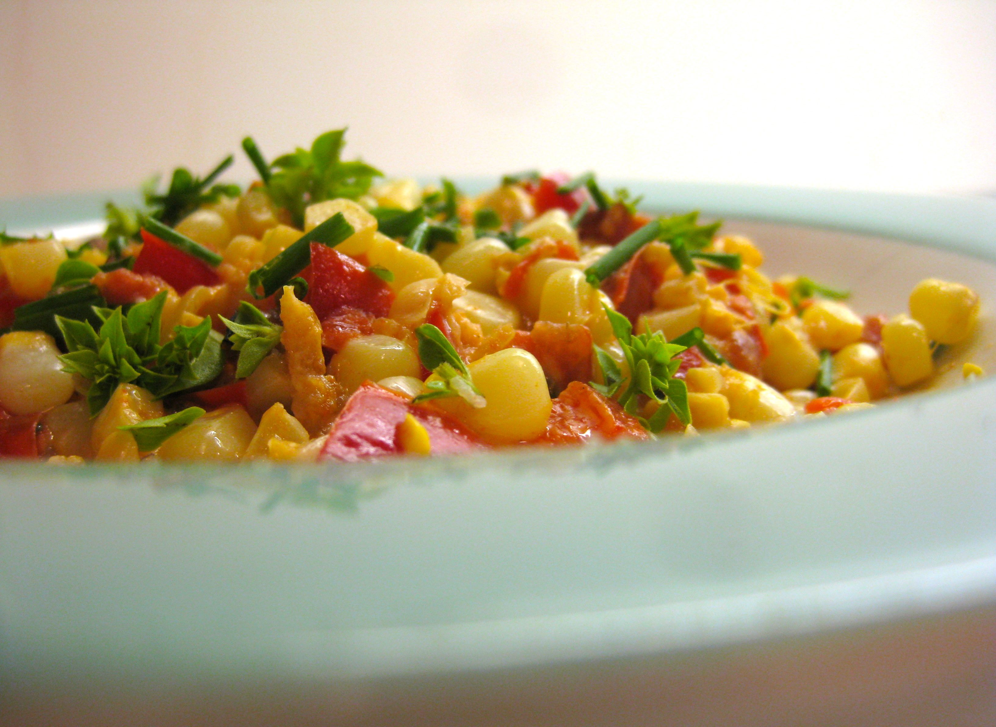 Add the scallions or onion and the red pepper pieces to the bacon fat and cook slowly until tender. Add the tomatoes and herbs and cook until well combined, 5 minutes or so. Add the corn and cream and cook for another 5 minutes or until the corn is tender. Season with salt and pepper to taste. Sprinkle with scallion tops or chives and tiny basil leaves.