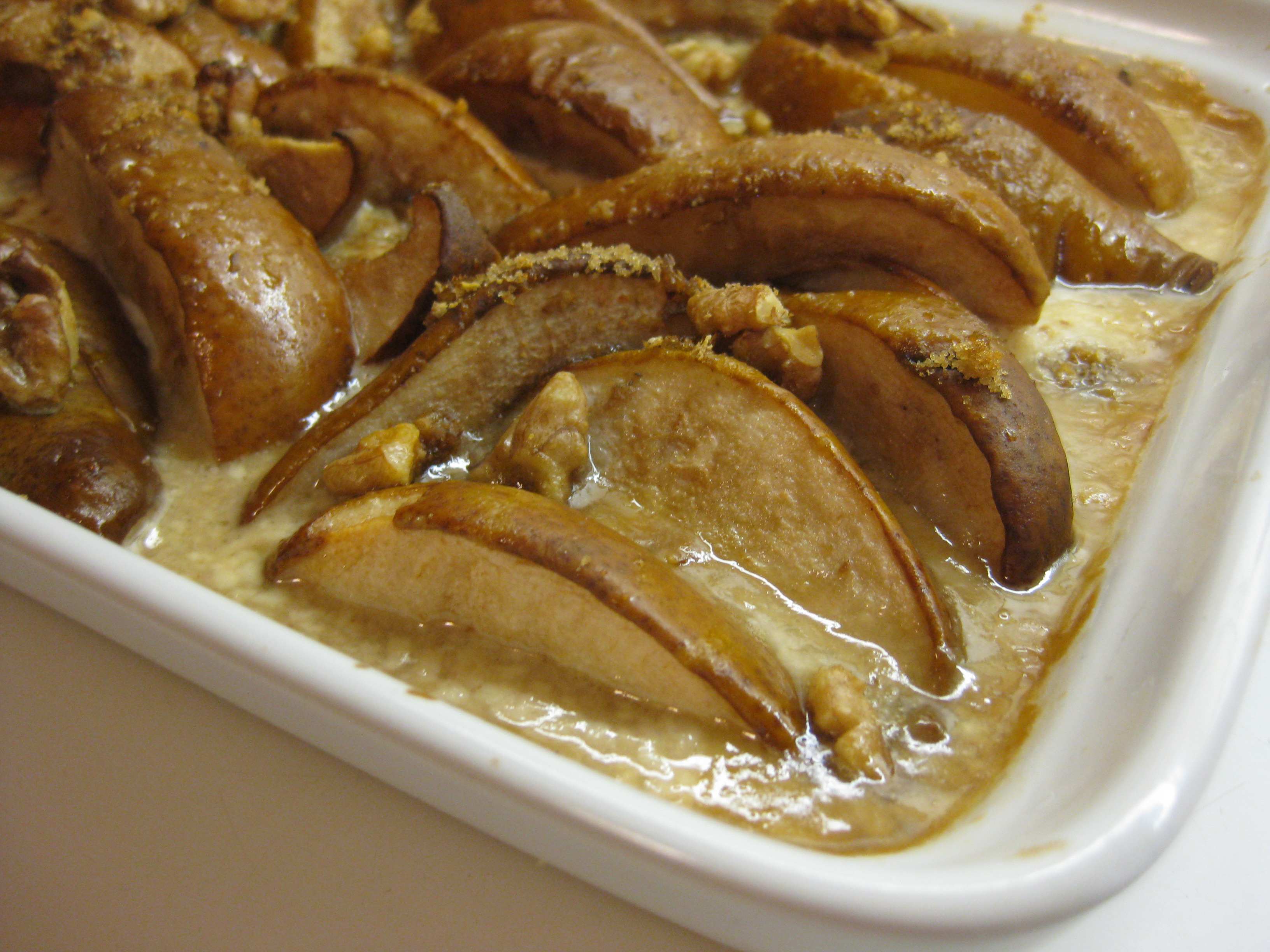 This is a go-to fall and winter dessert, a ready-when-you-are, last-minute triumph that seems more complex than it is. Winter pears (I typically use bosc), even slightly hard ones, are sliced, sprinkled with brown sugar that’s been spiced with ground cinnamon, nutmeg or mace (current fave) and doused with a little heavy cream. Add walnuts and/or seasonal dried fruit (raisins or cranberries). Bake in a 350-degree oven for 20 minutes or until the fruit is tender and the sauce has almost caramelized. Magic.