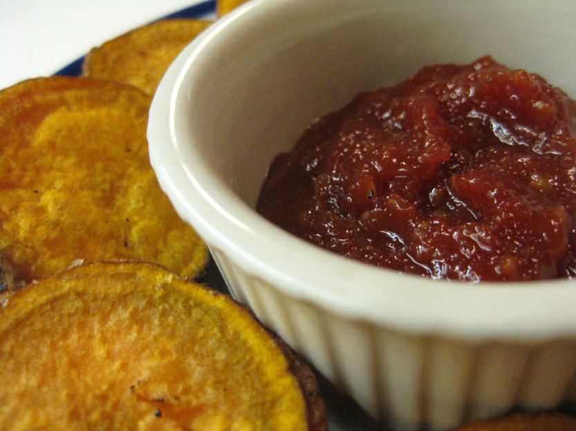 This came to light because her chutney recipe has been around the web recently, on blogs like The Traveler’s Lunchbox and The Wednesday Chef (thanks!). I tinkered with the proportions of ingredients and the method, creating a smooth ketchup instead of a chunky, raisin-filled condiment. It makes an amazing dipping sauce for oven-roasted potatoes and sweet potatoes. I canned it in four-ounce jars; the recipe made 8 small jars.