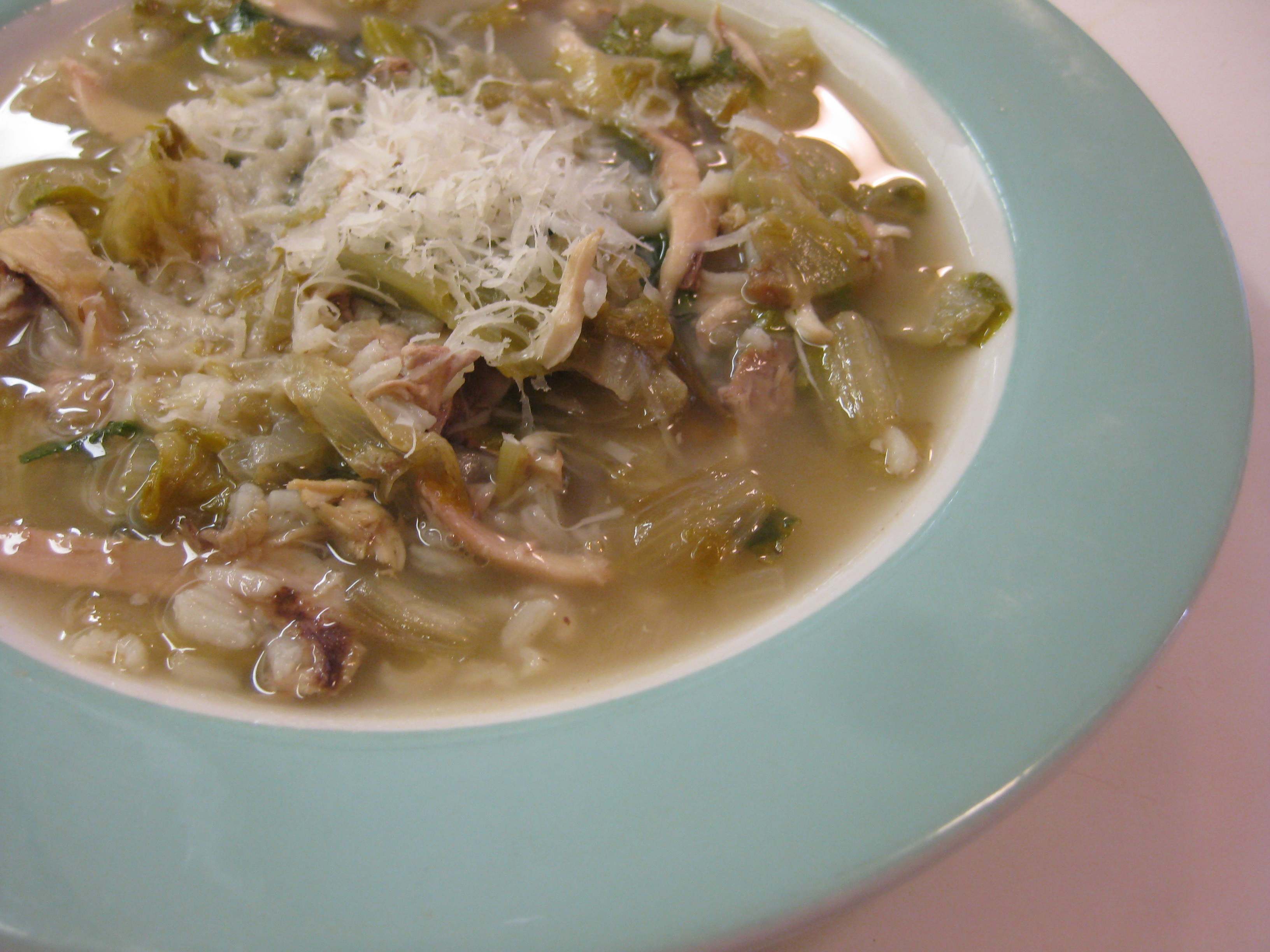 I used the stock and the stray bits of chicken that fell off the cooked bones in a delicious soup made from escarole and Romaine lettuce sautéed in butter and onion. As we are getting a lot of lettuce from our CSA these days, I end up with a lot of greens. Escarole stews well, and so do the robust leaves of Romaine lettuce. With the addition of rice, the soup was filling enough for supper.