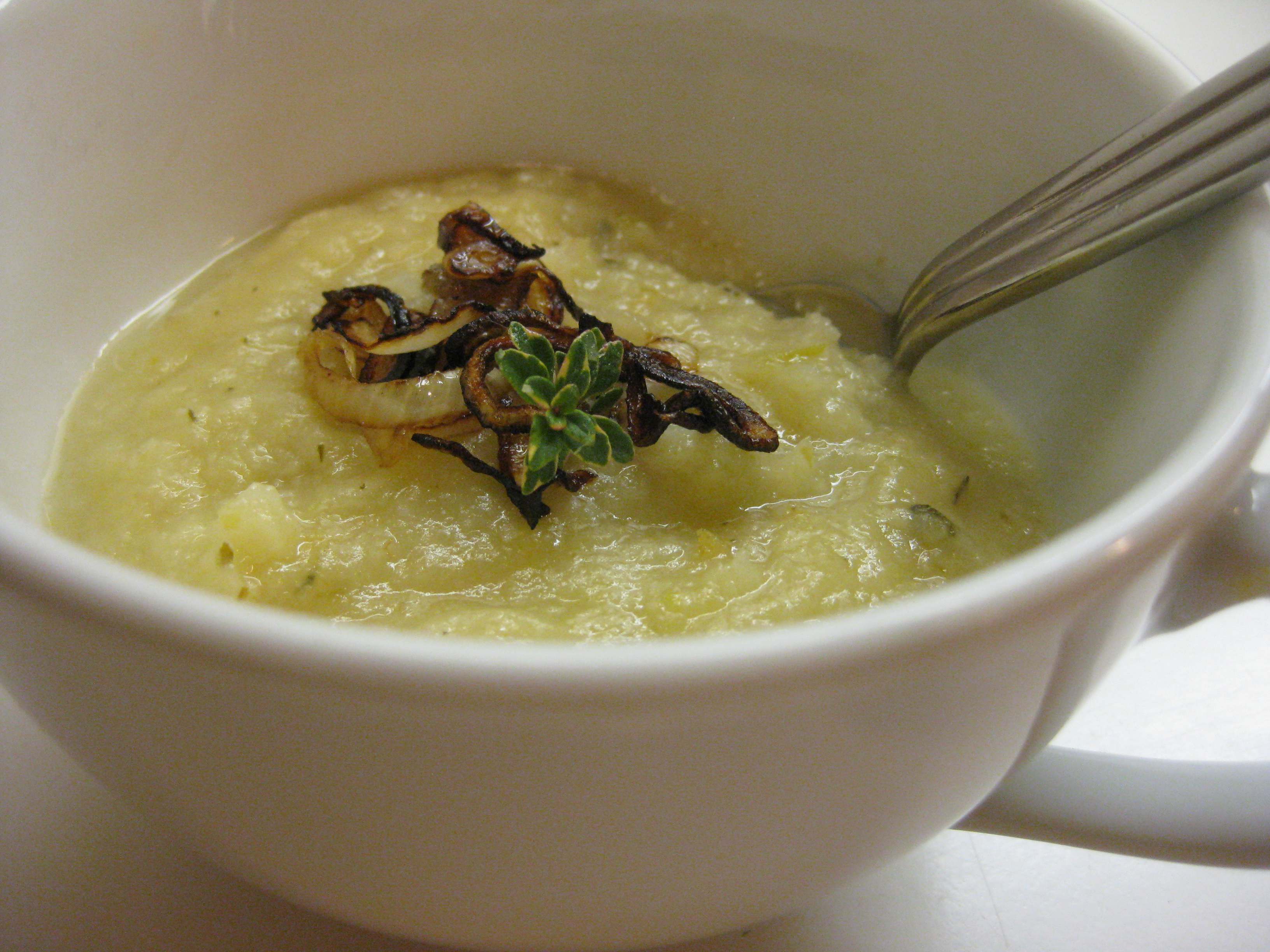 Saute the leek in a saucepan and add the parsnip, cooking it lightly before adding the pear, stock and thyme. Cook until the parsnip is tender, Puree the soup. Saute the shallot in butter until crispy and use for garnish along with fresh thyme if you have some.