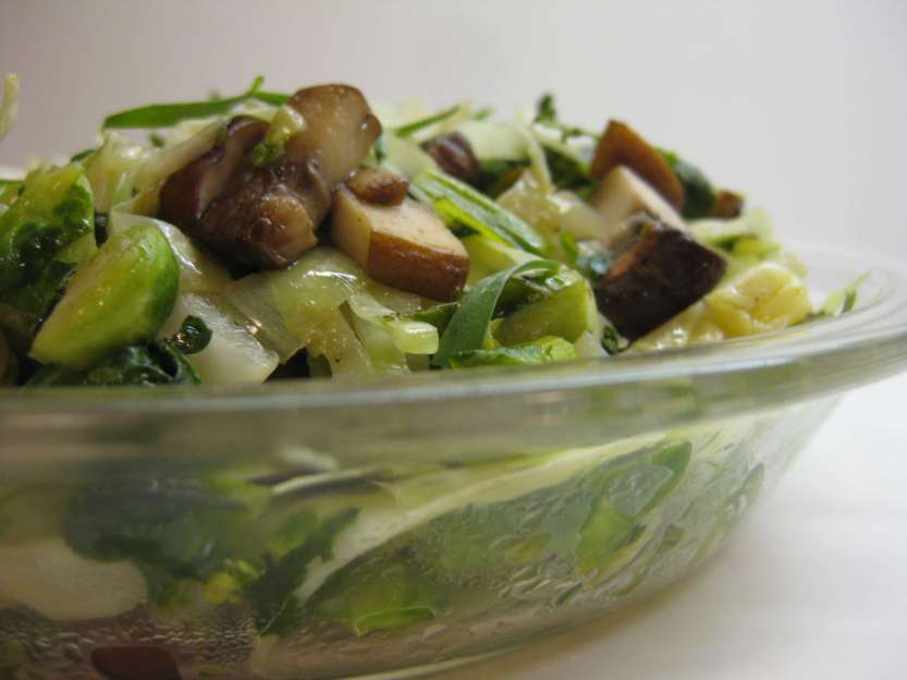 I think cabbage and mushrooms have a natural affinity, and I combine them lots of ways, from Chinese moo shu to this. Normally I would have used only cabbage in this pie. However, with an impending deep freeze, I sent the rescue squad into my garden to harvest big stalks of Brussels sprouts and then had to figure out what to do with them. This is one of the semi-failed crops of our local growing year and I’m lucky to have any at all. Normally, our CSA and farmers markets feature sturdy stalks ringed with plump green spheres, but not this year. The best we got were stunted, and ranged from the size of grapes to the size of peas, with those at the base blossoming.
