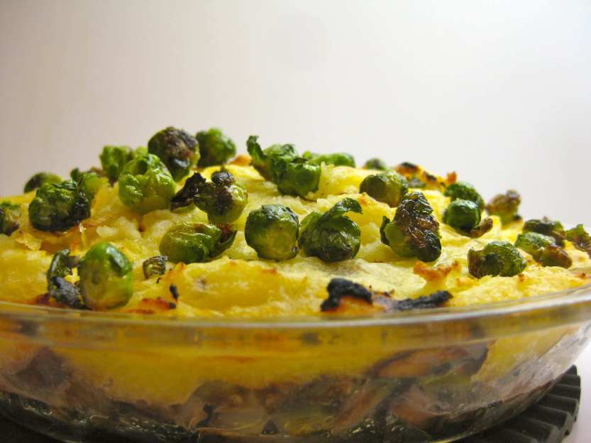 Now that title’s an oxymoron for you. Shepherd’s Pie is so called because it was originally made with meat from the herd — lamb or mutton to be exact — minced and topped with mashed potatoes. That would be a natural and easily accomplished dark days meal. The filling for this vegetarian version (preserving nothing but the potatoes) was a delicious combination of organic cabbage from our CSA, shredded Brussels sprouts and tarragon from my garden, and organic leeks and local mushrooms from the farmers’ market. Comfort food for one of the first really cold days we’ve had. I served it with a salad of local organic mizuna and arugula from my garden.