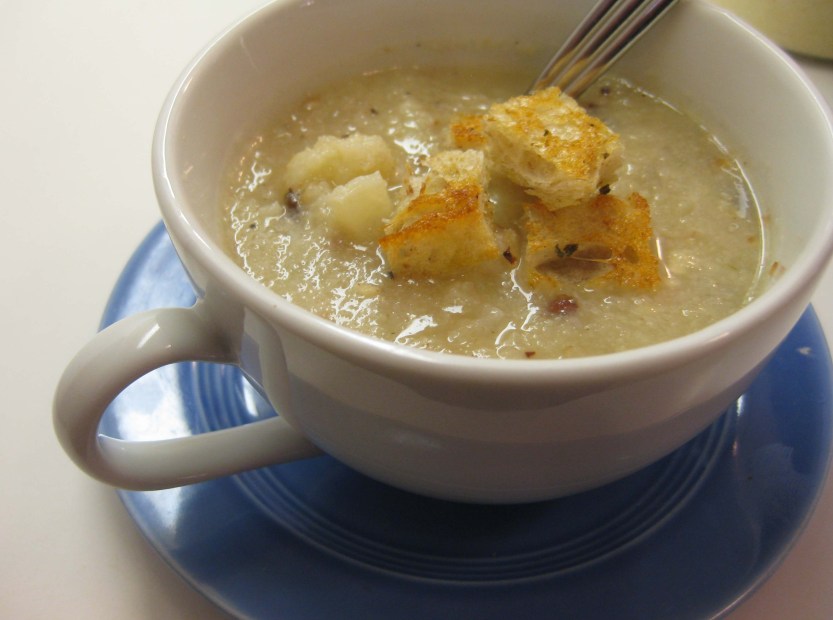 For my previous cauliflower soup, I roasted the vegetables (cauliflower and leeks) to deepen the flavor. Here, I bring it in from the outside, from rendered bacon, onion and garlic and, finally, from toasted hazelnuts. Slater, writing in The Guardian, claims this is a Polish recipe, but if he had said it was Austrian, I would have said “sure.” I pureed the hazelnuts with the soup instead of adding them afterward, since I wanted them to contribute to the texture. I omitted the bay leaf he called for during the braising stage since I didn’t have one on hand. That was probably a good thing. I tried a few herb combinations (dried rubbed sage, and then a dried rosemary-sage-garlic rub that I made from my garden) and found any would overwhelm the soup, which was great by itself as a showcase for cauliflower. I opted for crusty little croutons with the mixed herb rub; their crispy texture played well against the toasted nuts.