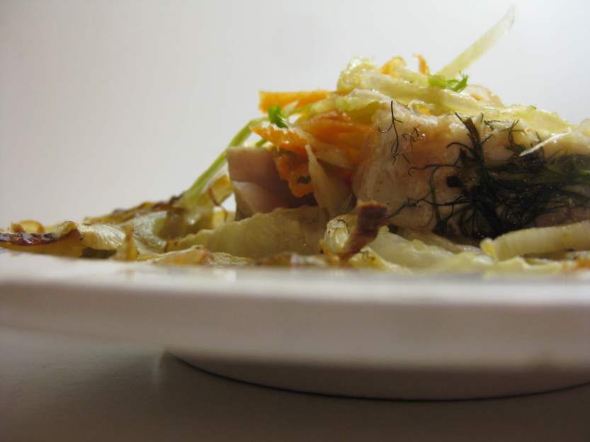 We like our vegetables and I like to experiment with multiple ways of cooking a single category to make a meal that seems that it has a lot of variety. This is a perfect case in point. I roasted slices of the bulb as a base for roasted tuna that had been flavored with fennel fronds. I grated the stalks and scraps of the bulbs along with carrots to make a raw slaw to serve on top of the tuna, dressed with local apple cider and maple syrup and my new favorite butternut squash seed oil. The fennel took on different tastes and textures throughout the dish. You’d never have guessed it was a Johnny-one-note meal.