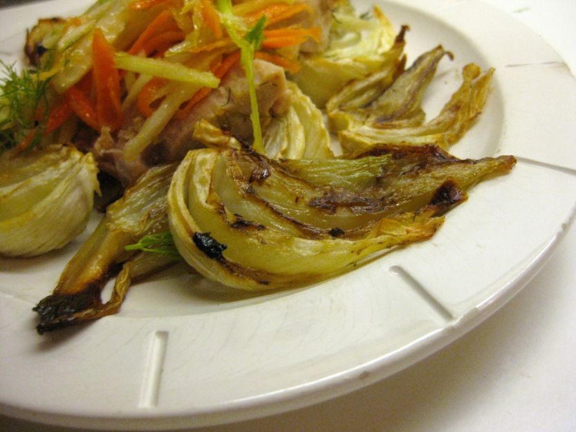 Preheat the oven to 375 degrees. Slice the fennel blub vertically into ¼-inch slices. Sprinkle with vegetable oil (I used butternut squash seed oil but olive oil would be more typical) and salt. Roast, turning once, until tender and brown, about 15-20 minutes.
